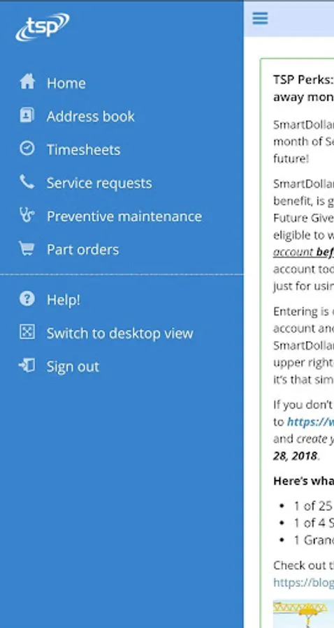 Exclusively for the use of TSP Inc employees and customers. Manage your service requests and company data from your phone.