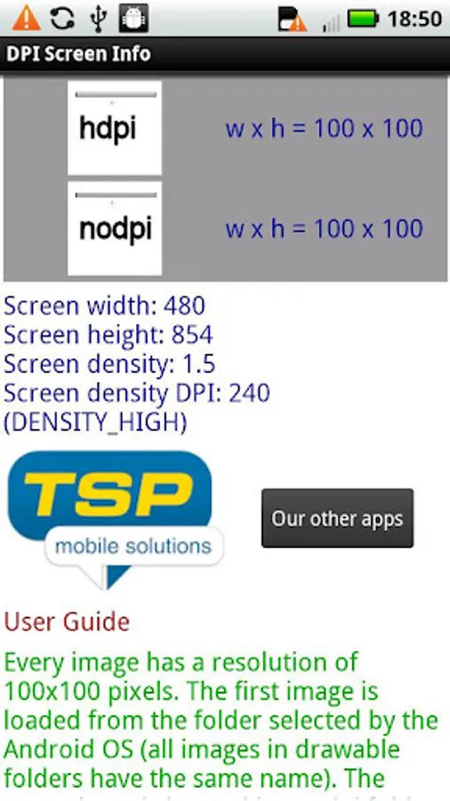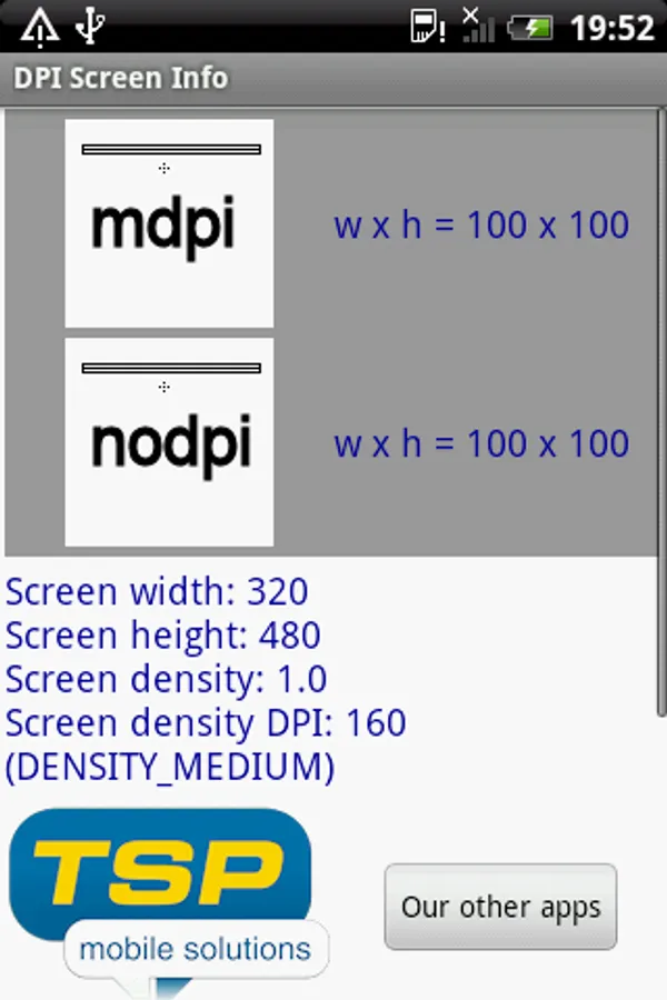 This application allows to detect exact screen density and screen category info. It shows which drawable folder is chosen by Android OS.