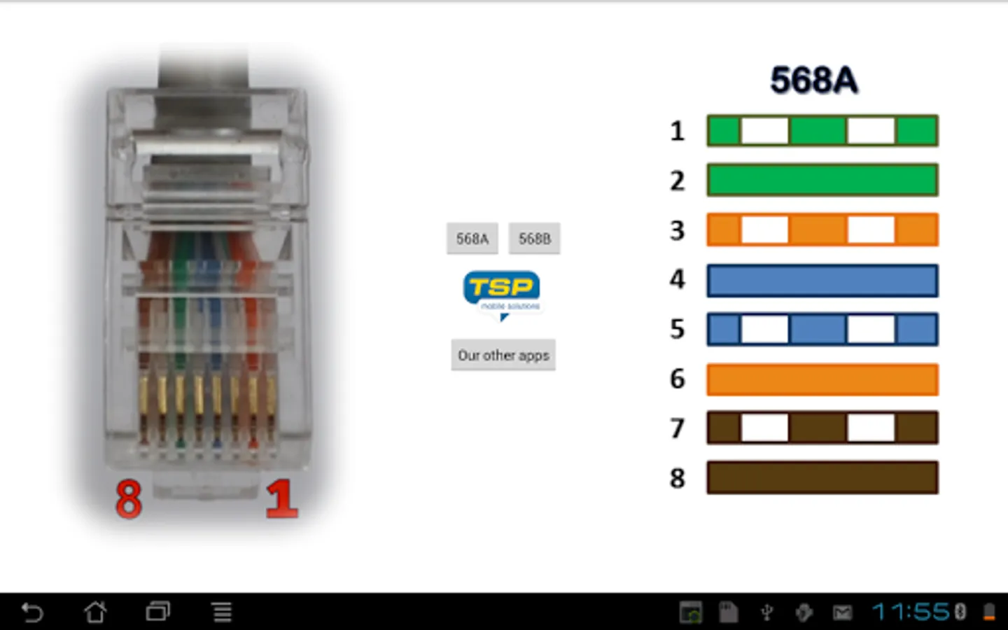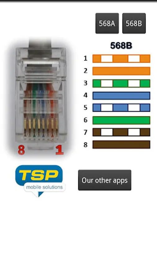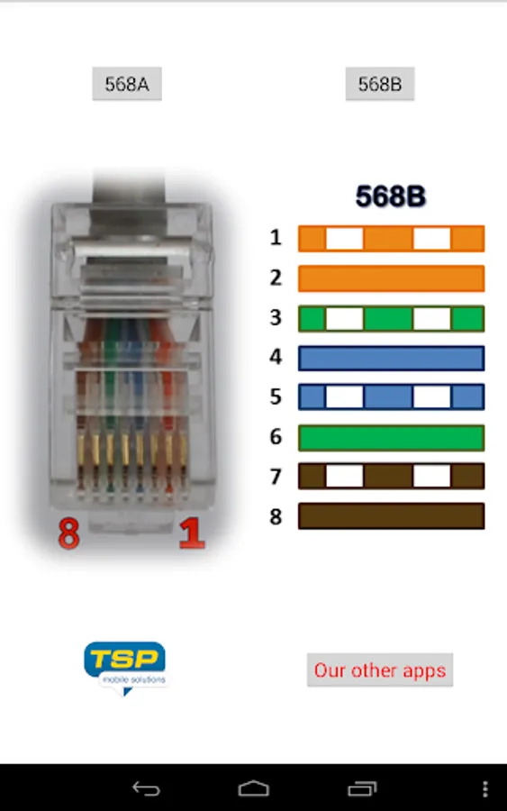 This application shows RJ-45 (Registered Jack type 45) color coding diagram and wiring pinout. Electrical cable connections are show both in 568A and 568B standard.