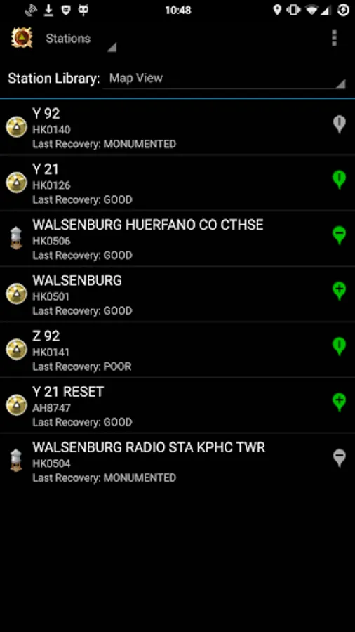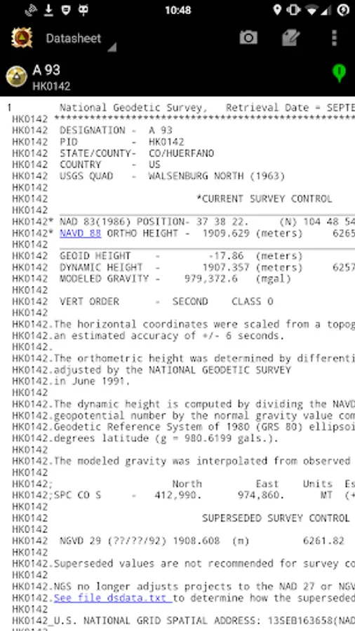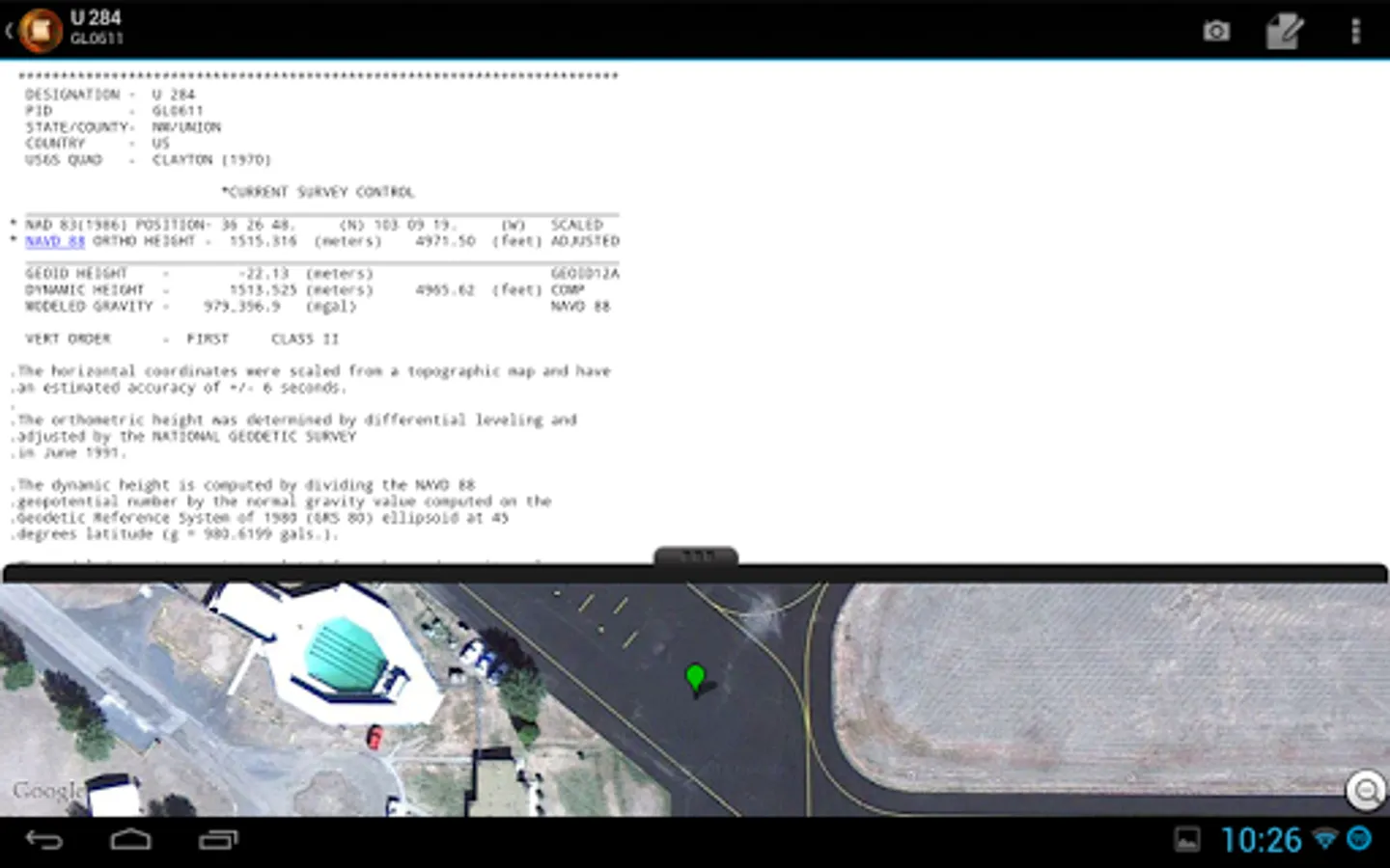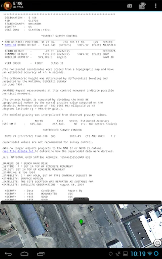 BenchMap allows searching and viewing of National Geodetic Survey (NGS) survey stations on an interactive map. The map will allow you to quickly determine if the control station is usable, and whether the chances that it still exists. Once a station is selected, you can view its datasheet - both in the app and through your web browser. You can also pull up the Geocaching page, in case there may be useful notes that aren't on the NGS's site.