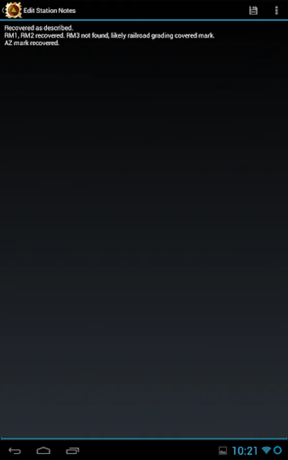Tools for submitting a recovery to the NGS inslude allowing you to take pictures of the station (using the recommended naming format), and record notes. (At this time, submission of recoveries is not possible in the app - but may be available in the future!)