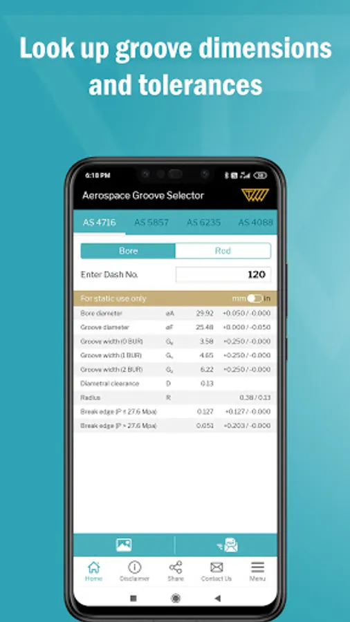 This app covers five of the most important SAE Aerospace groove standards for hydraulic systems, AS4716 Rev B, AS5857 Rev A, AS6235 Rev A, AS4088 Rev E and AS4832 Rev A. You can easily find groove sizes and determine if grooves are suitable for a dynamic and/or static seal. Available in Metric and Inch, based on standard Dash numbers.