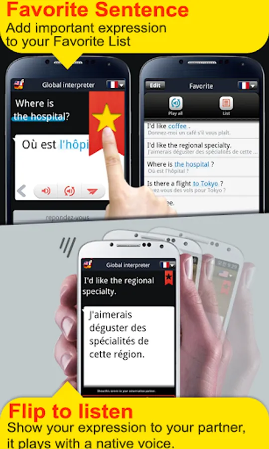 - When traveling abroad or studying, you can save a sentence to Favorite sentences and use it whenever you want.