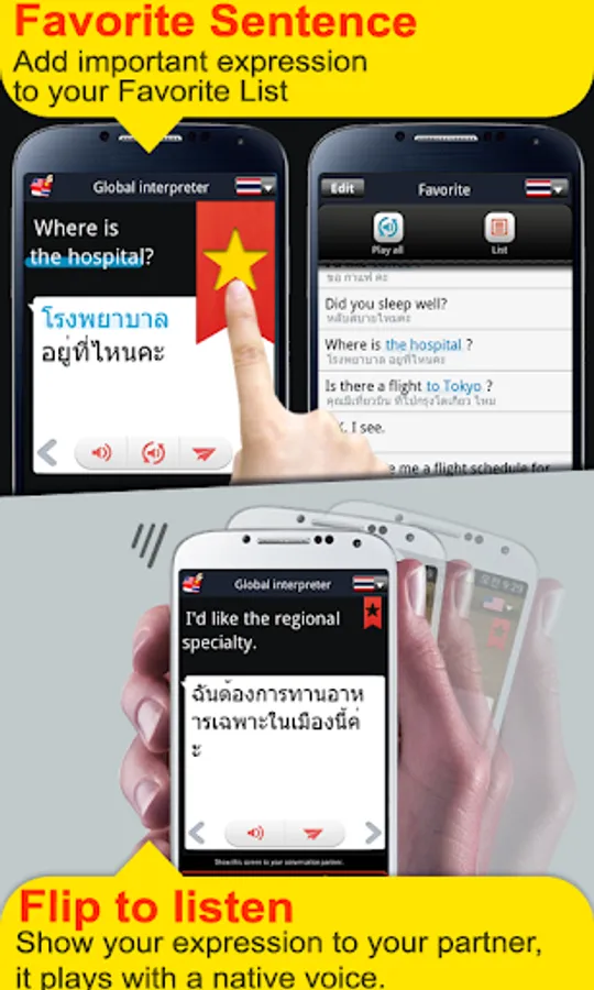 - When traveling abroad or studying, you can save a sentence to Favorite sentences and use it whenever you want.