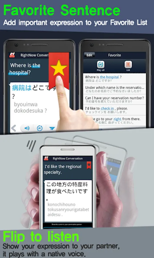 - When traveling abroad or studying, you can save a sentence to Favorite sentences and use it whenever you want.