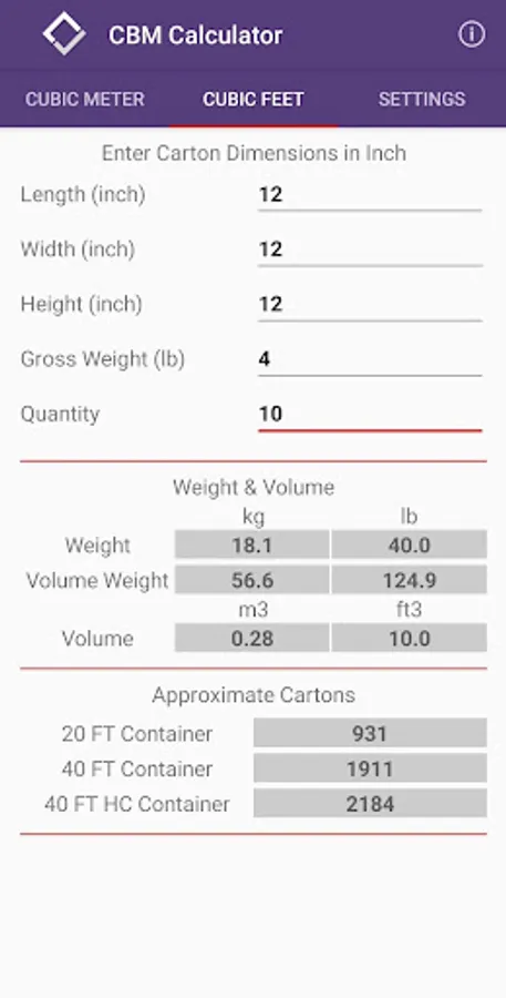 It helps user to calculate cubic meters (CBM) when shipping goods. User can get quick and easy calculation of how many product(s) will fit in a shipping container?