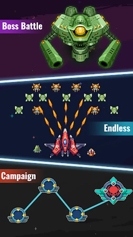 - More attractive modes: Experience & discover the galaxy shooters with difference modes like Endless, Tournament… and gain more rewards & excitement.