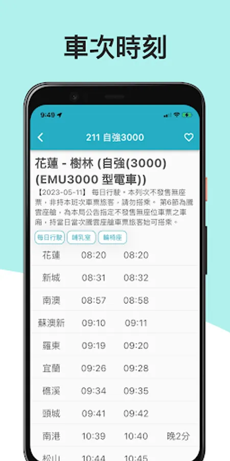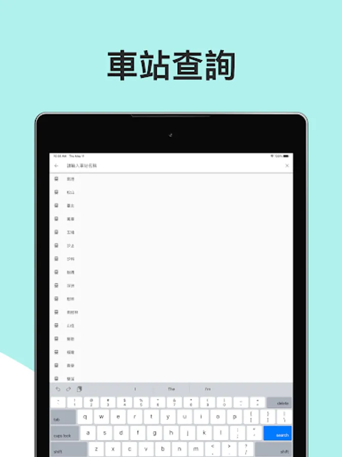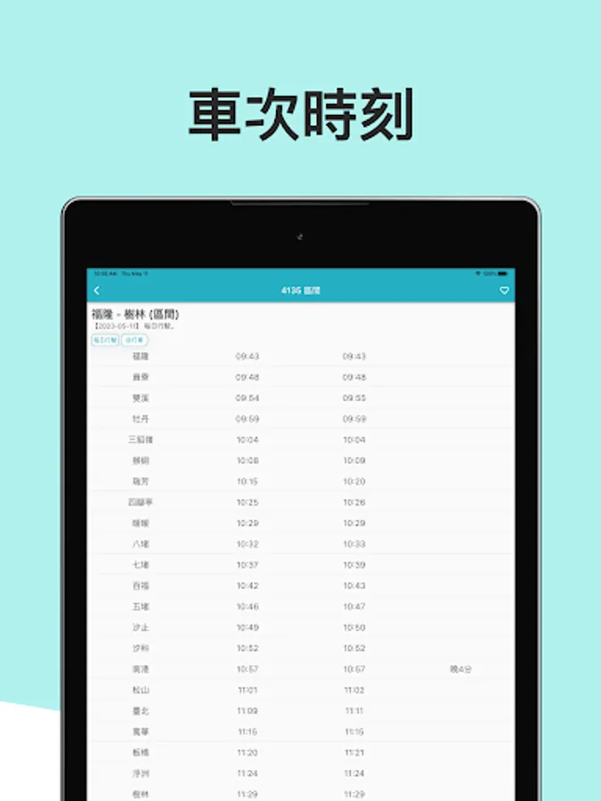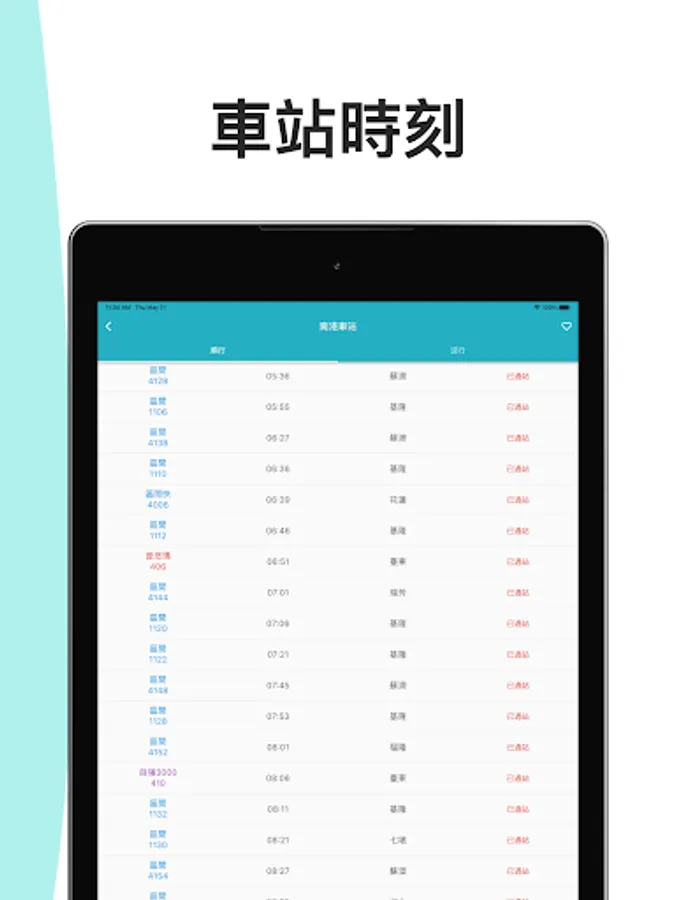*Station timetable supports 209 train stations of TRA, such as Taipei, Taoyuan, Tainan, Taichung, Zhongli, Banqiao, Hsinchu, Songshan, Shulin, Kaohsiung, Changhua, Nangang, Hualien, Xinzuoying, Xike, Xizhi, Ping East, Chiayi, Neili, Yingge, Zhunan, Keelung, Yuanlin, Fengyuan, Taitung, Xinwuri, Qidu, Puxin, Douliu, Miaoli, Xinfeng, Fengshan, Zhubei, Xinying, Luo Dong, Yangmei, Wanhua, Yilan, Ruifang, Chaozhou, Daqiao, Yongkang, Shanhua, Hukou, Shalun, Liujia, Fuzhou, Daqing, Baifu, Gangshan, Shalu, Dajia, Badu, Tanaka, Houli, Xinshi, Nanzi, North Hsinchu, Tanzi, Wudu, Taiyuan, Dounan, Yuli, Songzhu, Minxiong, Xinzhuang, Fugang, Shanjia, Dahu, Jiaoxi, Luzhu, Wuquan, Yuanli . Shetou, Tonggong, Ershui, Fulong, Zhuifen, Rich, Nationality, Rende, Liuying, Lilin, Dacun, Tongxiao, Nanao, Shuangxi, Xishi, Zhiben, Linnei, Beihu, Heping, Jiabei, Neiwei, Zuoying, Sijiaoting, Sanyi, Changrong University, Ruisui, Wuri, Shuishang, Suaoxin, Chishang, Zhuzhong, Dadu, Chenggong, Sankuaicuo, Houzhuang, Xiangshan, Guanshan, Dongshan, Linfengying, Toujiacuo, Houbi, Ji'an, Su'ao, Nanzhou, Jinlun, Houtong, Nuannuan, Guangfu, Tai'an, Yongjing, Baishatun, Linbian, Xincheng, Zhudong, Zhongzhou, Zhixue, Neiwan, Fenglin, Shifen, Gushan, Longjing, Shoufeng, Fuli, Zhuoqiao, Rinan, Qianjia, Zhutian, Return, Dali, Luye, Qiding, Pingxi, Taimali, Jingtong, Daxi, Dawu, Jiji , Nanjing, Dongao, Gongliao, Sandiaoling, Peony, Pomegranate, Balin, Linluo, Kanding, Jiadong, Badouzi, Erjie, Waiao, Liukuaicuo, Ronghua, Beipu, Sicheng , Shigui, Nanshi, Guishan, Dingpu, Dashan, Taichung Harbor, Zhuoshui, Xinfu, Hengshan, Checheng, Donghai, Xinpu, Haike Museum, Jialu, Hexing, Shuili, Toyota, Shangyuan, Heren, Jiuzantou, Ruiyuan, Fuyuan, Wanrong, Lingjiao Station, etc.