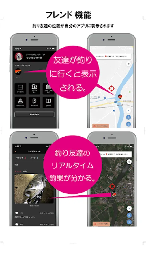 アプリ上でつながっている仲の良い釣り友達が釣りに行くと、どこで釣りをしているか自分の地図に表示されます。