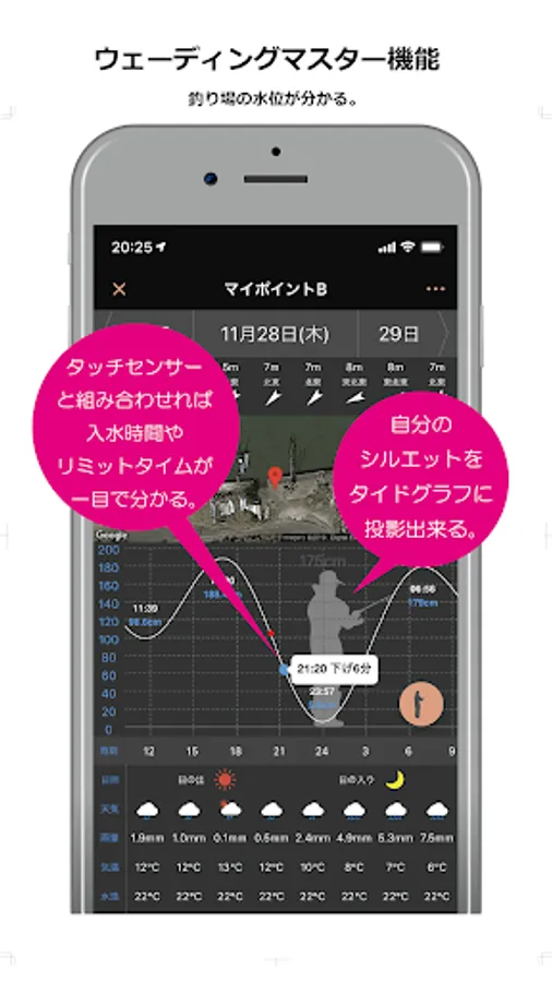④ 自分の釣り場のタイドグラフに自分のウェーディングシルエットを投影出来る