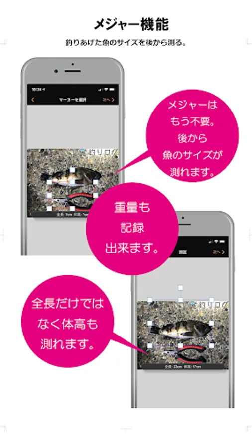 メジャーを忘れても安心。後から釣り上げた魚のサイズ計測が出来る釣りログメジャー。しかも全長だけではなく、体高も測れる優れもの。重量も記録出来ます。