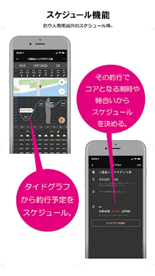 ⑤ 釣り人ならではの、その釣行場所の潮時(しおどき)から釣行予定の詳細スケジュールを決める釣りログスケジュール機能。