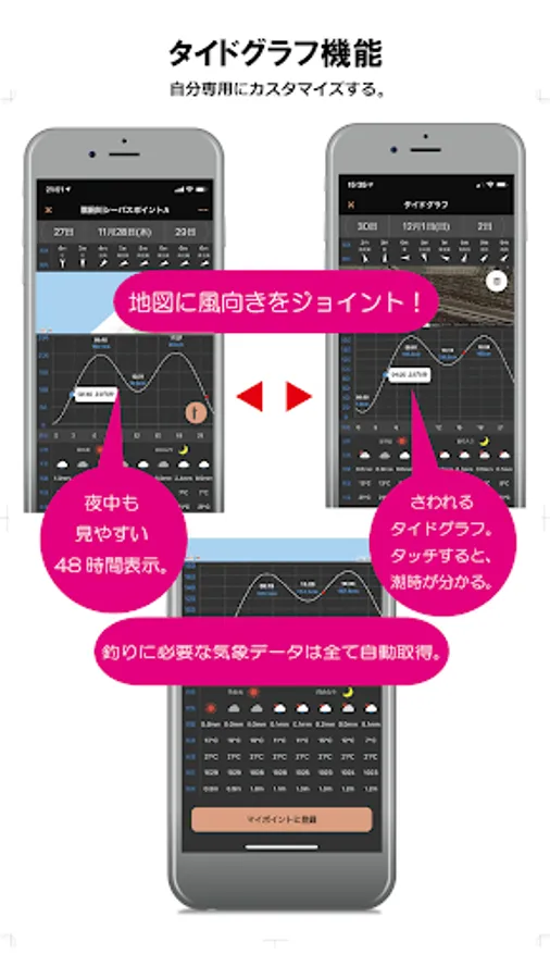 釣り人なら絶対に必要な気象情報をセレクトしてタイドグラフに搭載。自分の釣り場マップとタイドグラフをつなげ、同時に表示します。