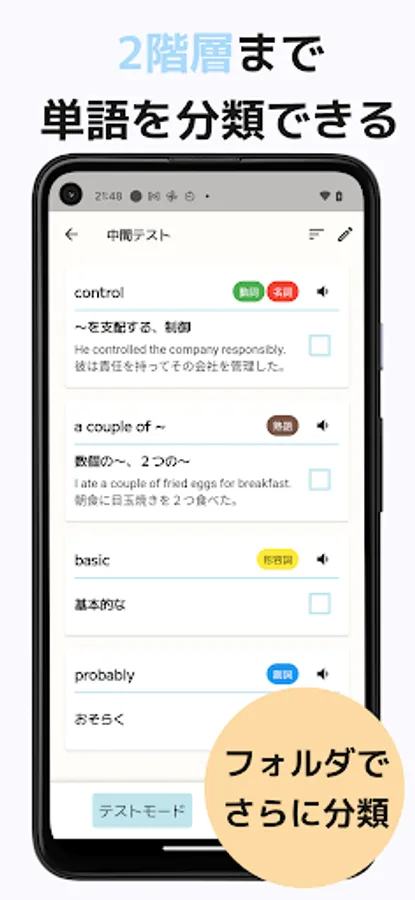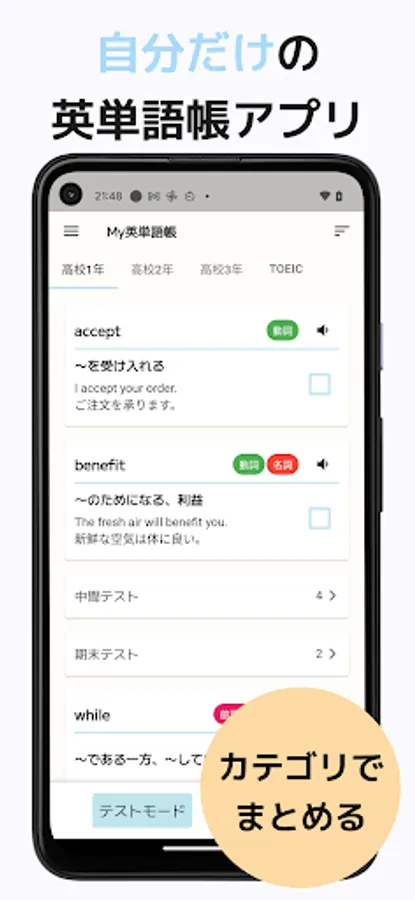 For example, you can categorize words in an easy-to-understand manner, such as "1st year high school" → "Mid-term test".