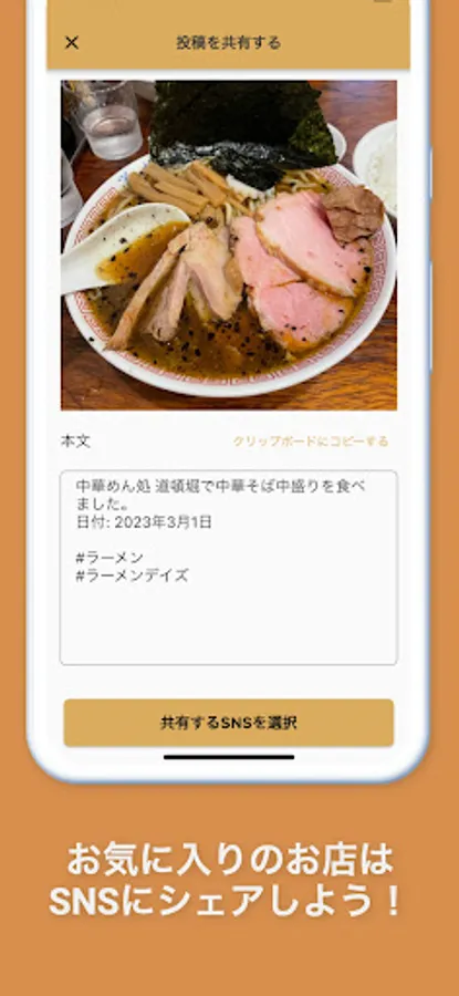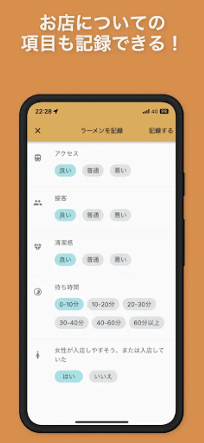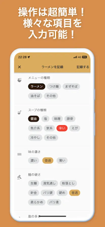 ・You can record detailed ramen information such as evaluation of the taste of ramen, soup, hardness of noodles, and depth of flavor.