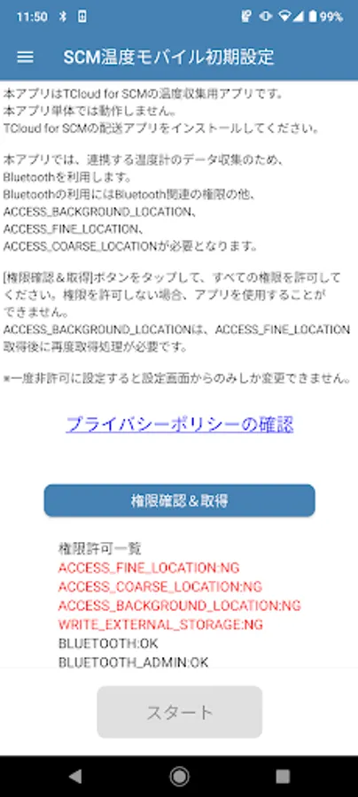 ・In the temperature collection function, which is the core function of this application, Bluetooth is used to collect data from the linked thermometer. In addition to Bluetooth-related permissions, access to location information is required to use Bluetooth. This app will not work properly if all the required permissions are not granted.