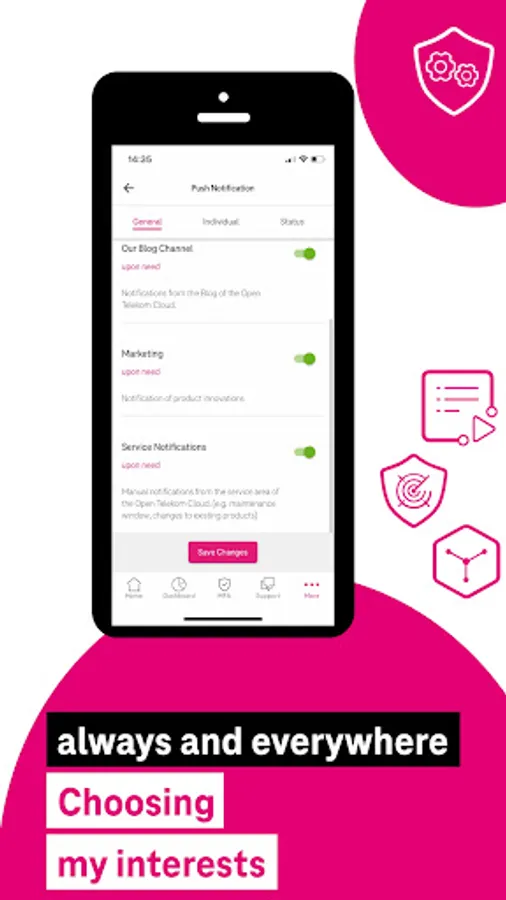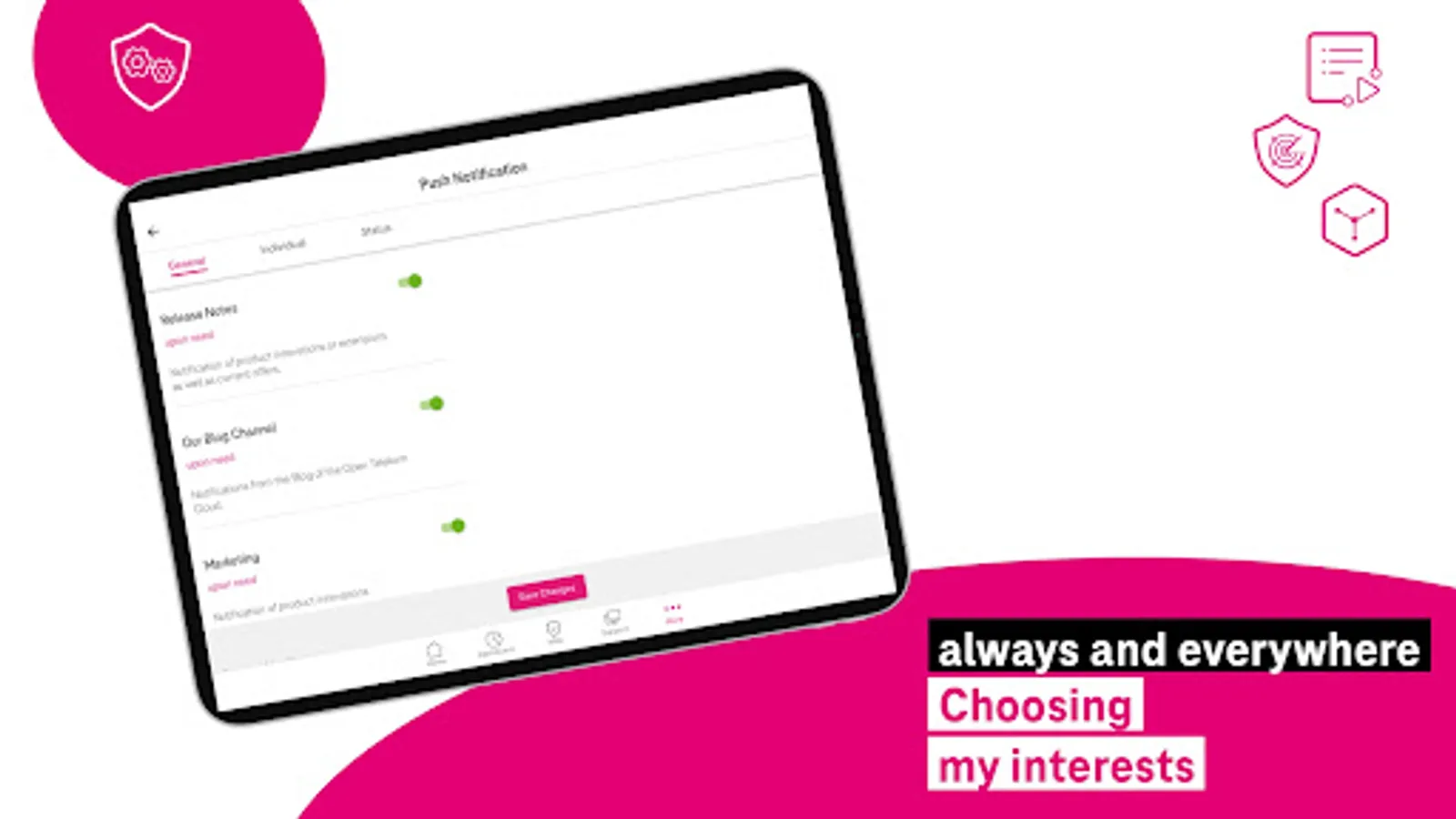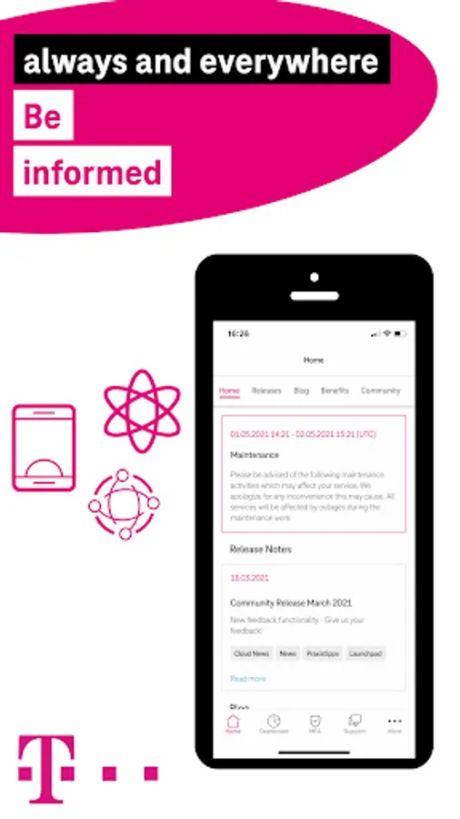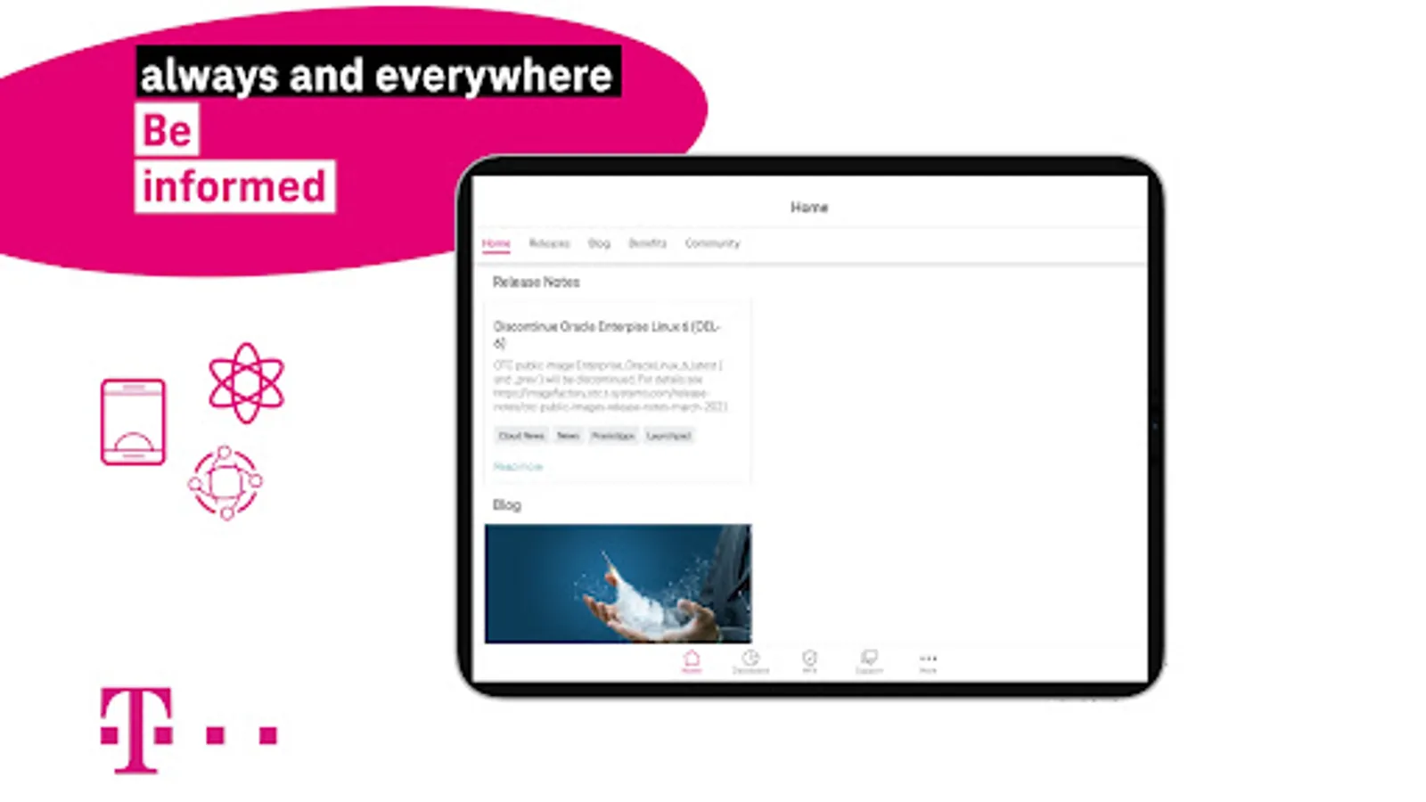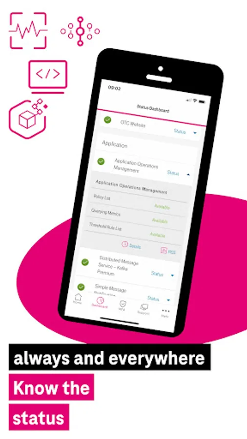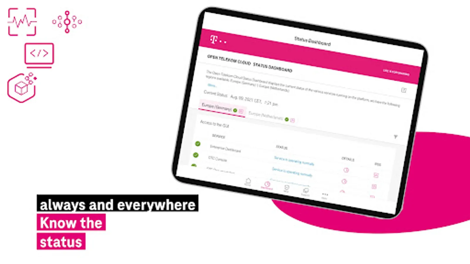 The Open Telekom Cloud mobile app provides you round-the-clock status updates on your tenants. You will be notified directly via push notifications about events from the status dashboard, system alerts, news about our product and have the most important pages of the Open Telekom Cloud (homepage, community, service description, etc. ) directly in one place.