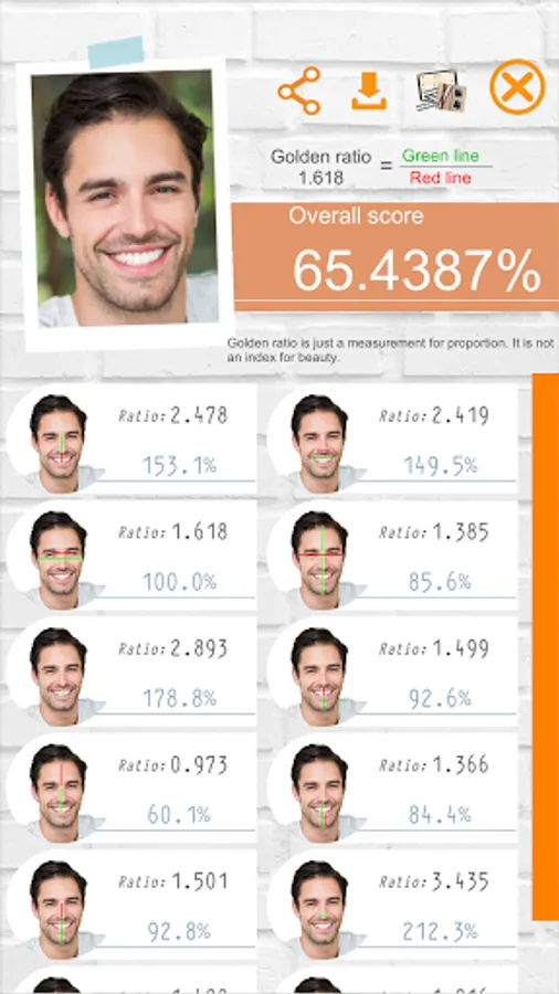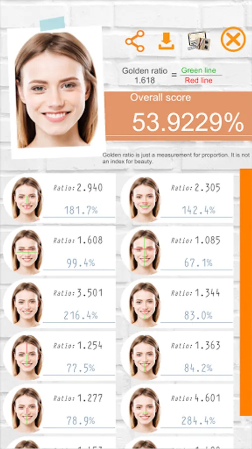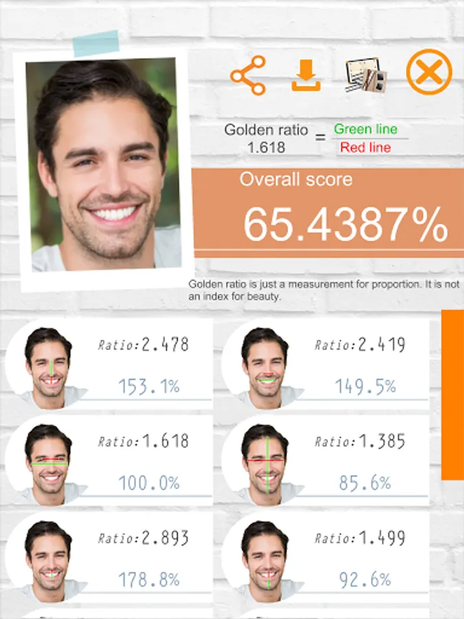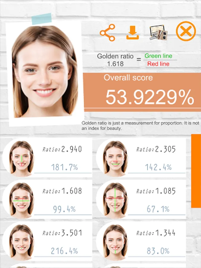 It measures the ratio of facial features and using the golden ratio as a reference, generating the 12 golden ratio scores and the overall percentage of the golden ratio.