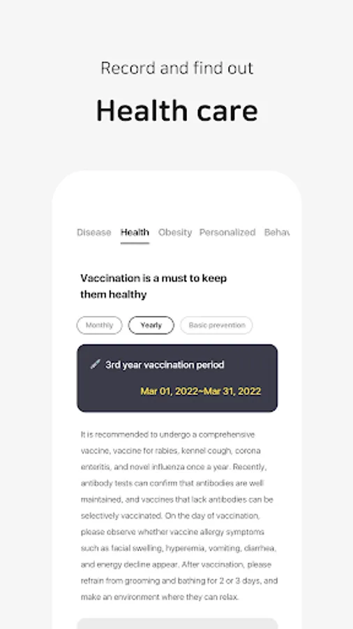 • Record and manage vaccinations, health checkups, and breathing rate during sleep according to their life cycle.