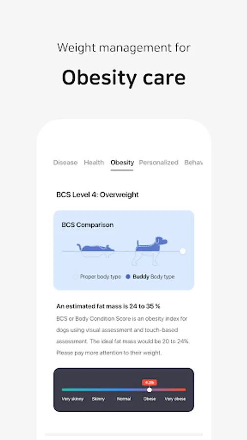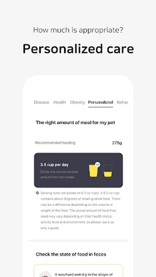 • Check recommended calorie intake, feed amount, and diet management method suitable for your companion animal’s weight and age.