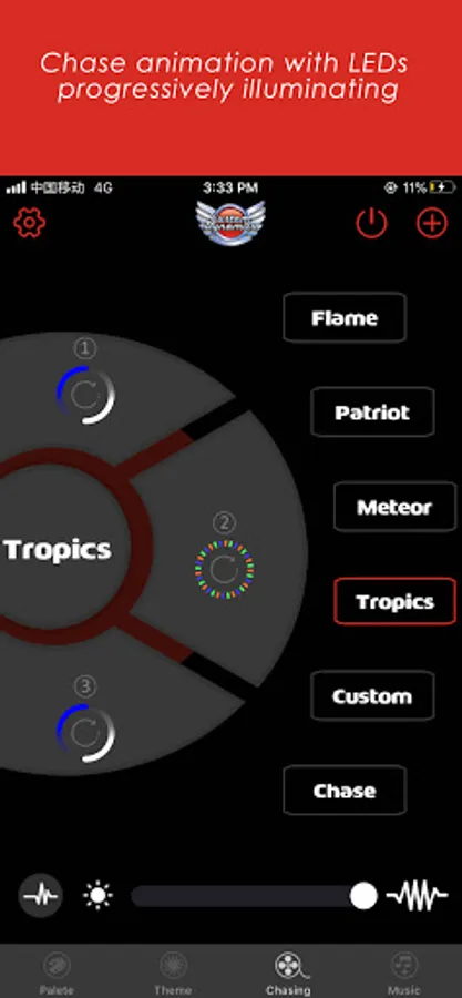 Chase animation with LEDs progressively illuminating in selected direction with preset themes including Flame, Patriot, Meteor, Tropics & Custom (available for ProGLOW® lighting system only).