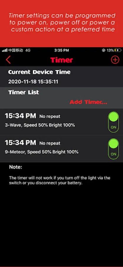 Timer settings can be programmed to power on, power off or power a custom action at a preferred time.