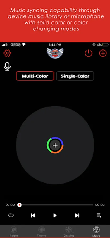 Music syncing capability through device music library or microphone with solid color or color changing modes.