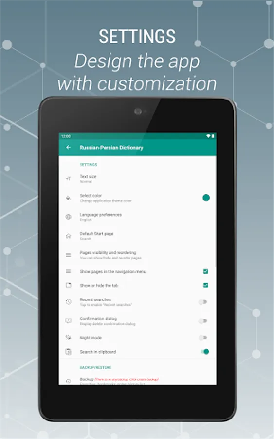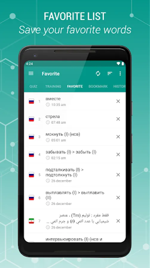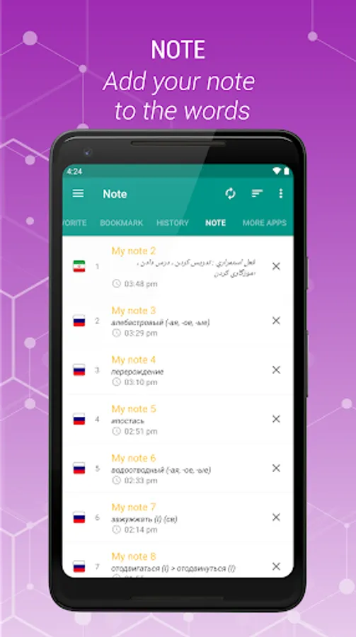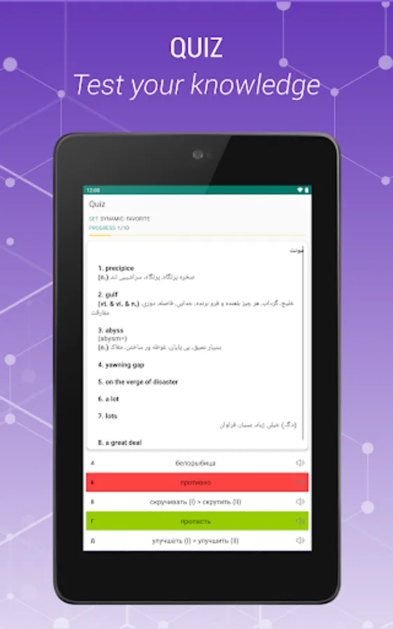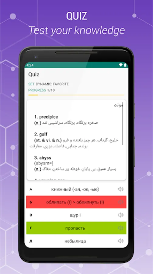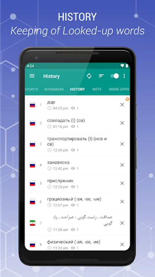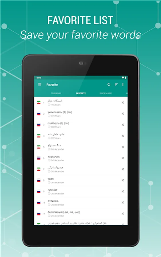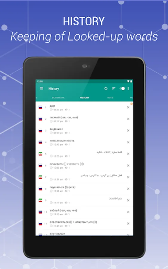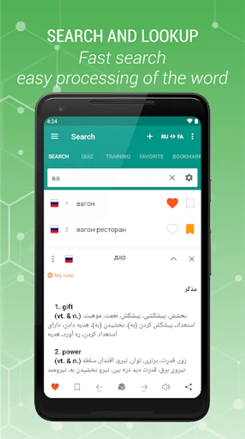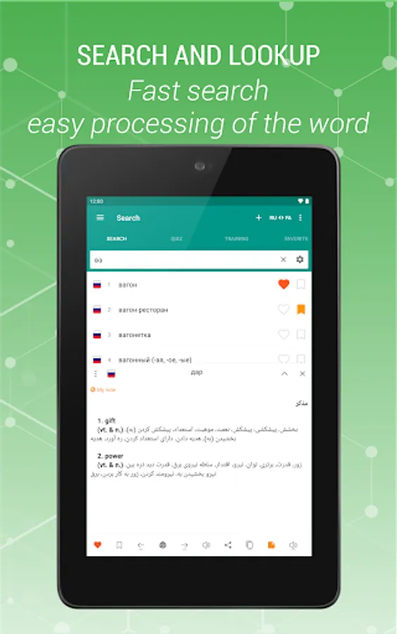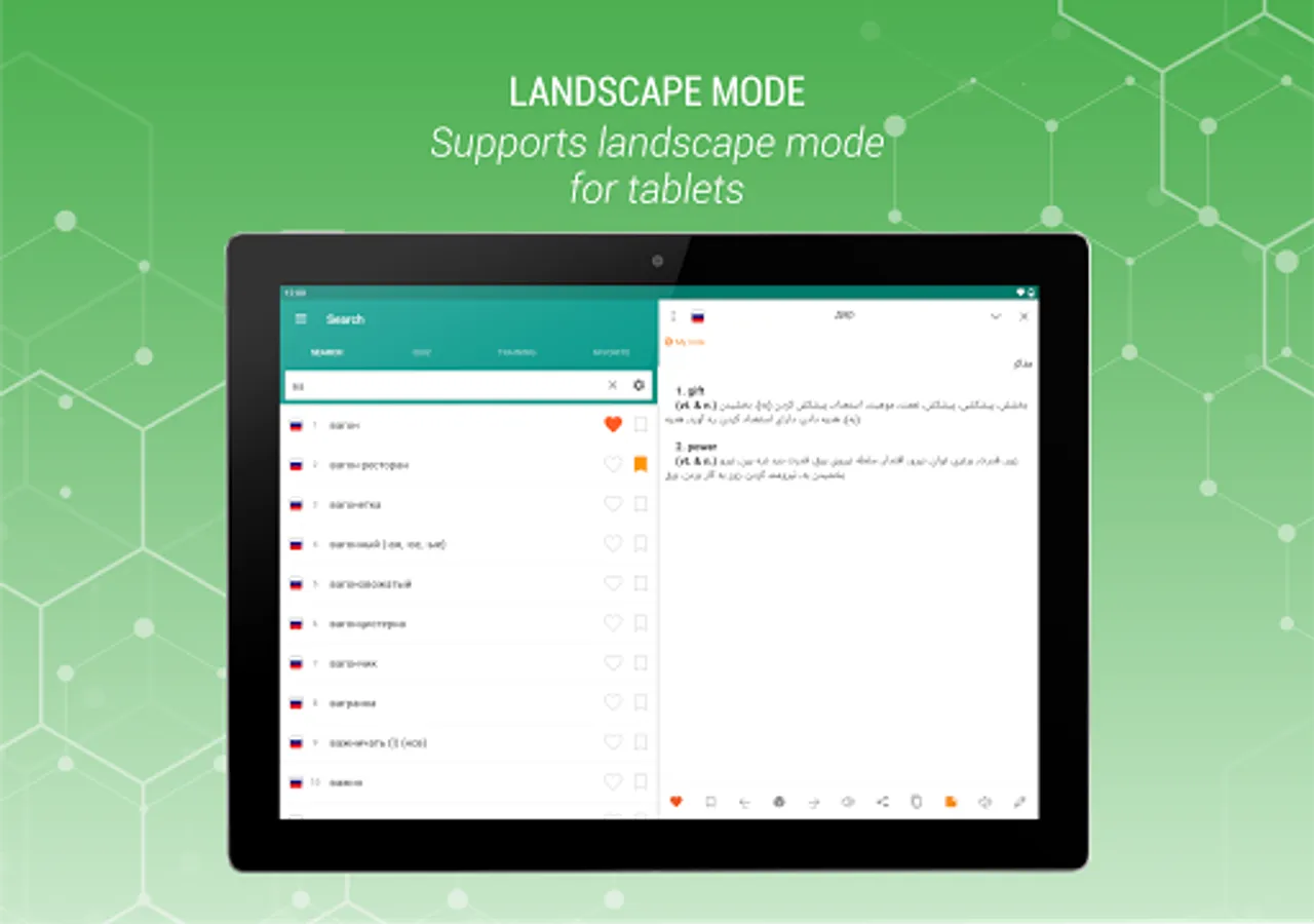 Russian - Persian and Persian-Russian is a free offline dictionary (vocabulary) with easy and functional user interface, covers over 47.000 words.