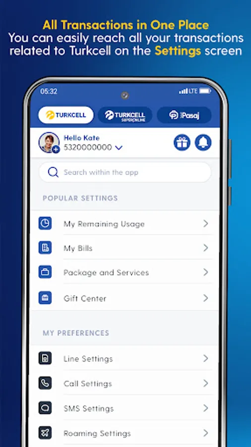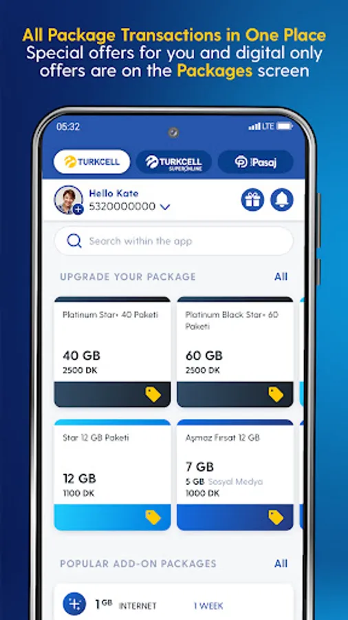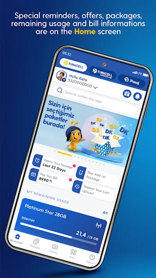 With Turkcell app, you can monitor your usage, view and pay your invoices, top-up your account, purchase packages, shop for electronics and much more with ease, speed and free of charge. You can easily switch between Turkcell and Turkcell Pasaj on the renewed interface. Through the app, you can find the opportunity to access our special promotions, reminders and offers. It is time to discover the privilege of shopping for many technological products throughTurkcell app with Turkcell Pasaj!