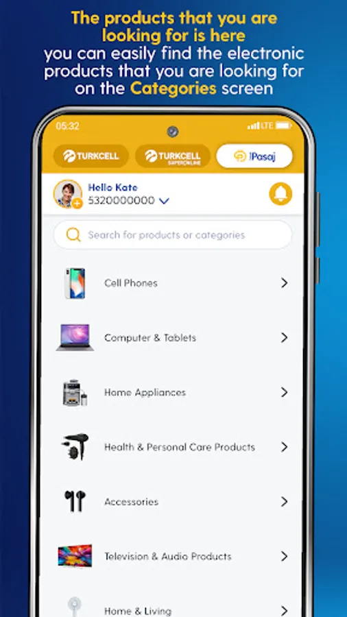 Turkcell Pasaj is Turkey’s first electronic marketplace. You can access Turkcell Pasaj from Turkcell app’s welcome screen. You can follow the campaigns and special offers from the home page. You can review thousands of technological product from the “Categories” section, and follow the status of your orders from the "Orders" section. In the "Pasaj" section of Turkcell app, you can seize the additional installment opportunities offered for you in mobile phones, smartwatches, computers, tablets, household appliances, personal care products and many other categories, in addition to credit cards and addition to the invoice.