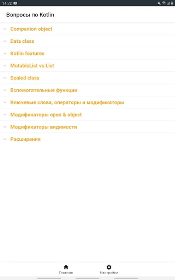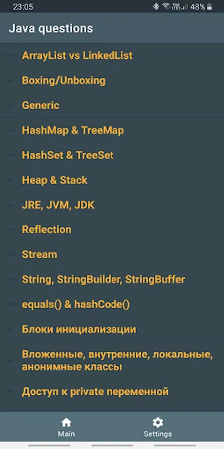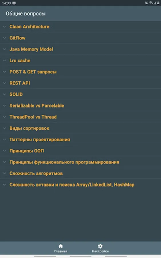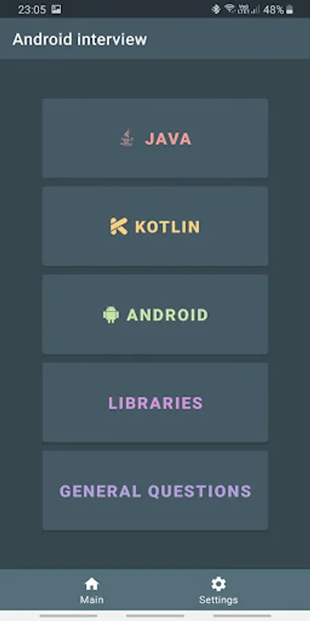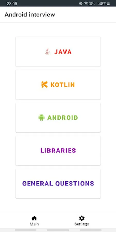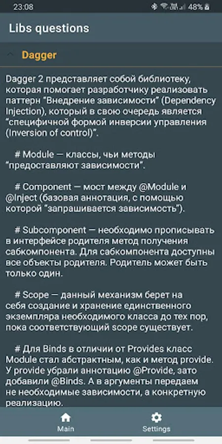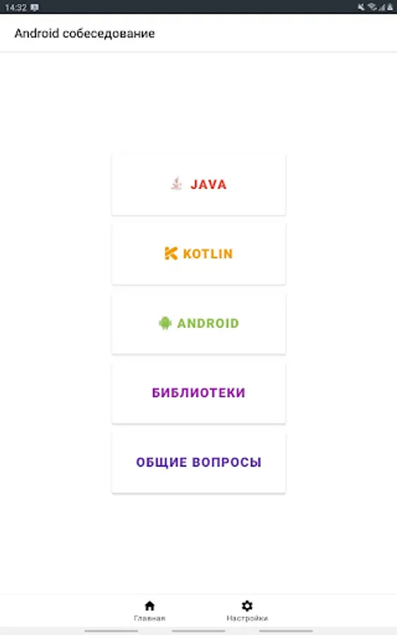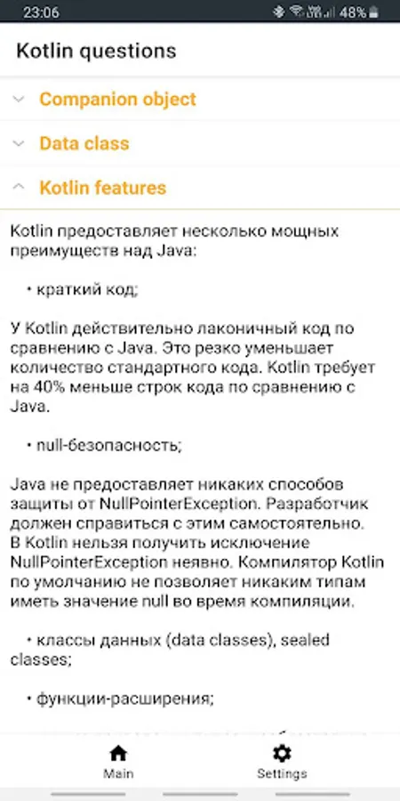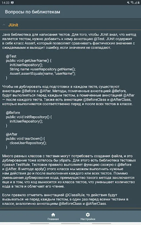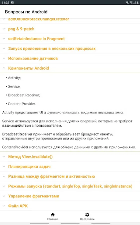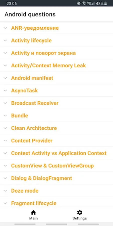 The application contains the most frequently asked questions and answers to the position of a Junior / Middle Android developer.