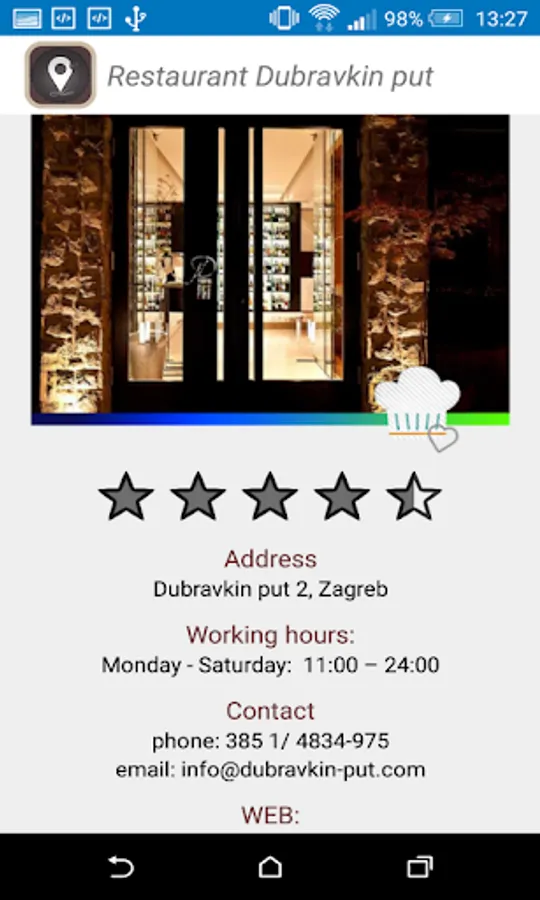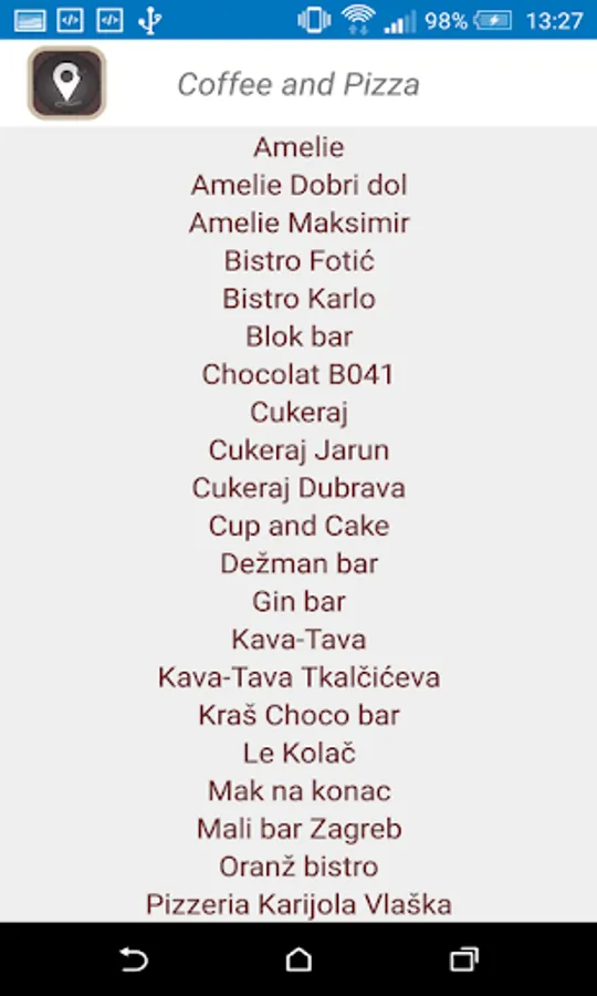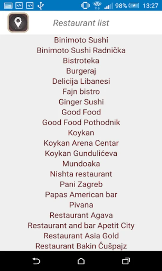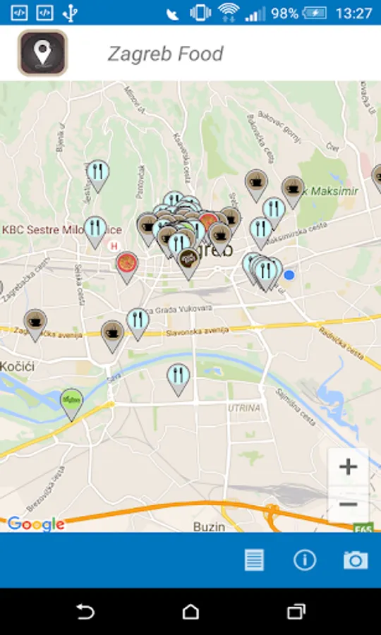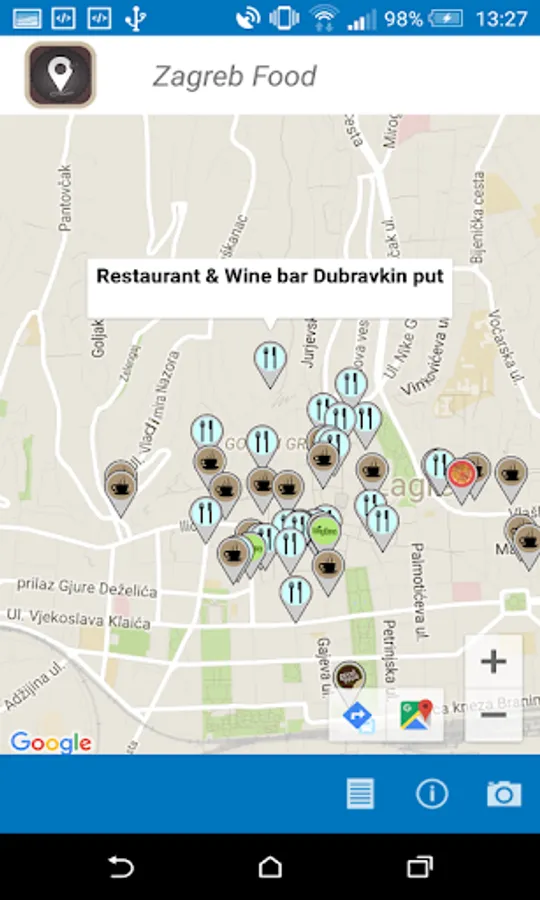 Zagreb Food is the application which gives you the overview of the restaurant and other food spots in Zagreb. Focus is on the new and interesting gastronomy objects for real hedonists and upcoming tourists to enjoy. Main function of the application is to overview all objects on the Google map which are shown like pushpins. User tap each object and get some information about it like general info and website. With Zagreb Food you will be informed about the restaurants in Zagreb.