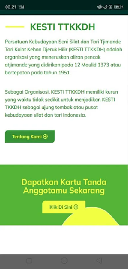 The Cultural Association of Silat Arts and Tjimande Dance Kolot Dance Kebon Djeruk Hilir (KESTI TTKKDH) is an organization that continues the flow of pencak atjimande which was founded on 12 Maulid 1373 or coincide in 1951.