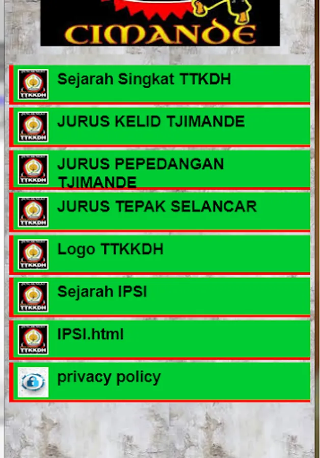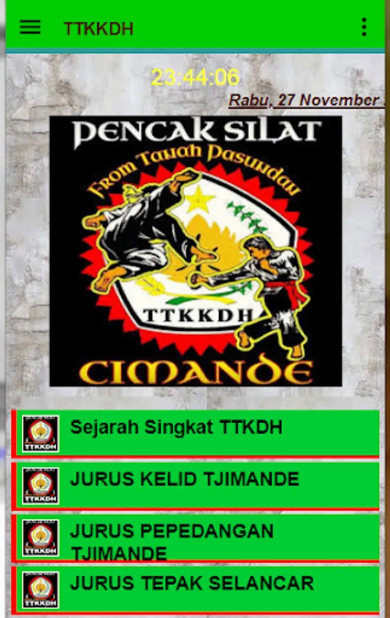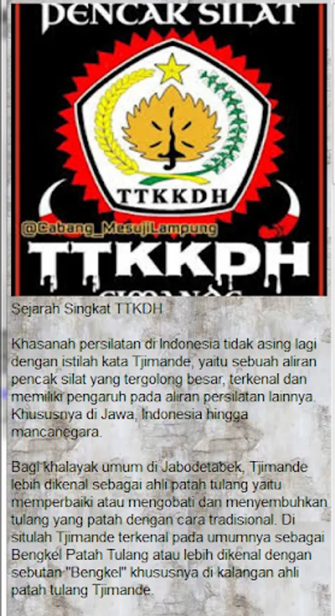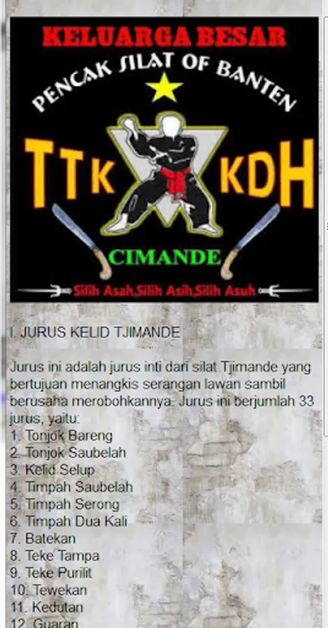 TTKKDH or Tjimande Tari Kolot Kebon Djeruk Hilir is a martial arts school based in Banten, West Java, Lampung and other places. TTKKDH, or better known as Cimande Silat, existed around the 1770s, which at that time was introduced by Abah Khoir from Bogor.