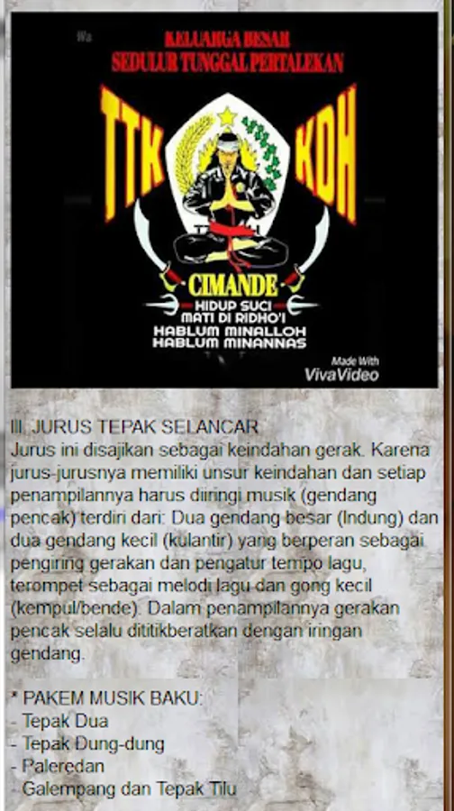 Cimande Silat is already familiar in the Indonesian martial arts world, especially in the Pasundan area, almost the majority of the people have learned this martial art. Every person who wants to learn Cimande Silat must pass through several rituals, among "Talek" or swear one of the points is "It is not allowed to hurt others if they are not hurt". The next ritual is "Rujakan" which is drinking bitter coffee, sweet coffee, bitter tea, sweet tea, young coconut water, eating 7 colors, 7 forms of cigarettes, 7 forms of flowers and eating roosters. This is meant that in living life, full of problems, hard-to-get, rich-poor and pencak silat is not a means for heroes. Instead it is used to be wiser and wiser in every situation. Pencak Silat Cimande itself there are 21 kelid or stance, each of its members must be able to and master these moves.