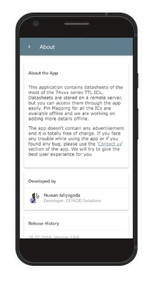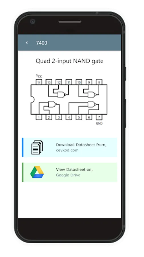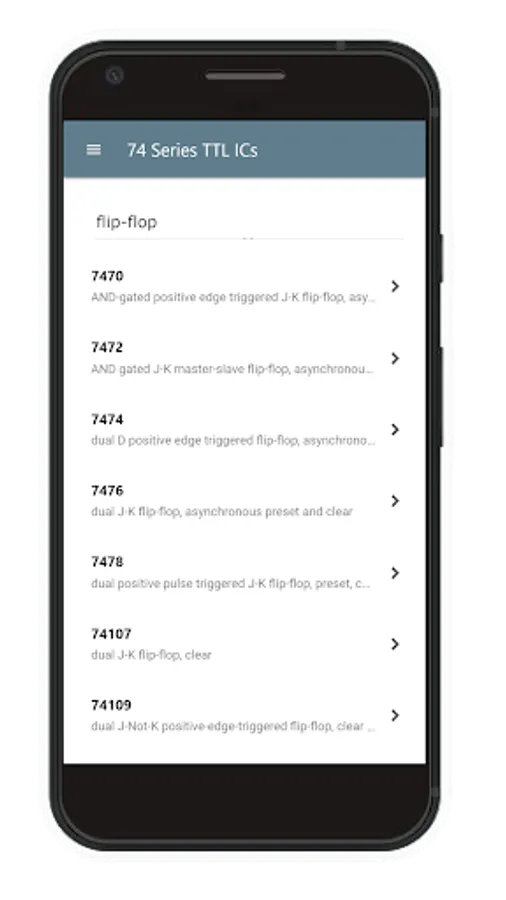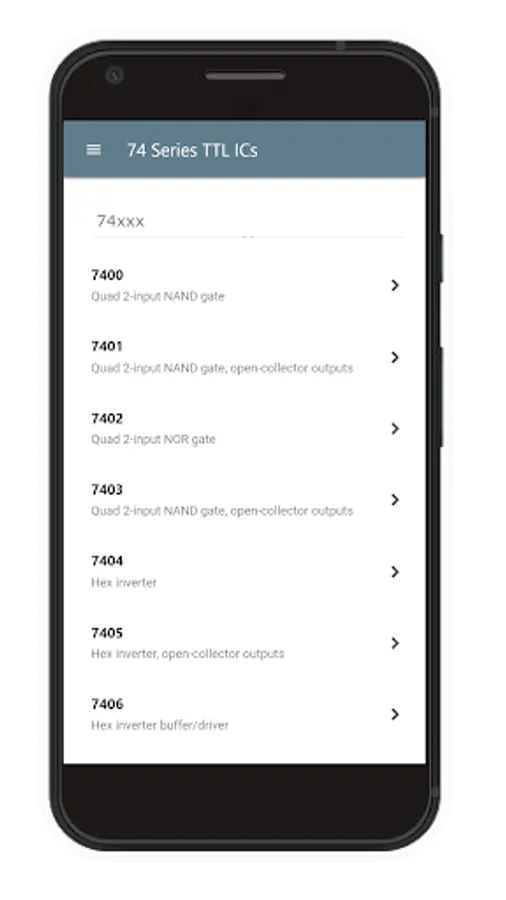 This application contains datasheets of the most of the 74xxx series TTL ICs. Datasheets are stored on a remote server, but you can access them through the app easily.
