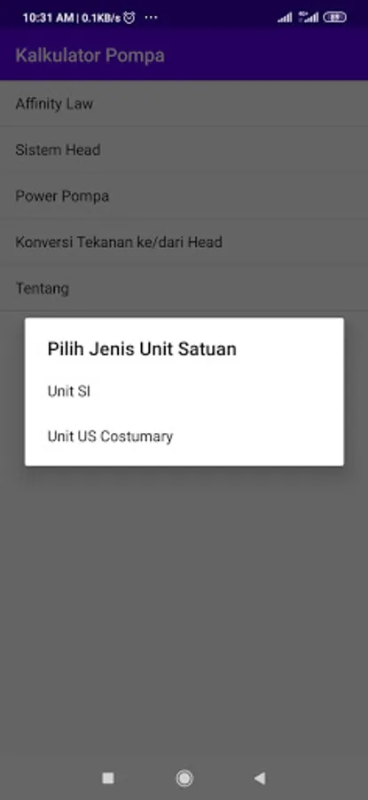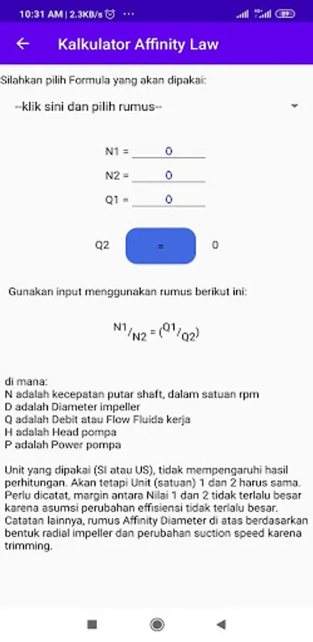 1. Affinity Law, namely the calculator calculates Head, Flow, and Power due to changes in diameter and shaft rotational speed.