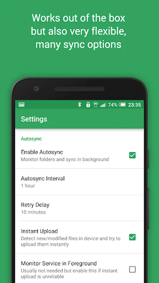 • Configurable autosync interval: 15 minutes, 30 minutes, every hour,...