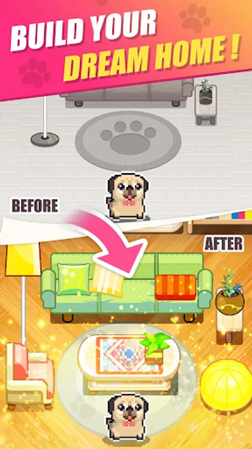This is an awesome Home Design Game. You can adopt a pet dog, dress up it, design pet home and play puzzle game with pixel art. We have plenty of houses for you to design and decorate! House Styles like American style, Mediterranean style, Japanese style. Many free styles and furniture combinations await you in-game!