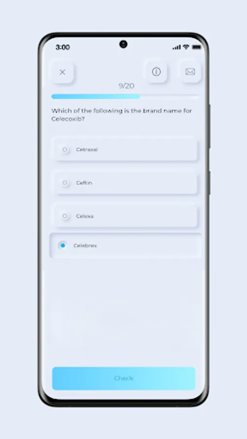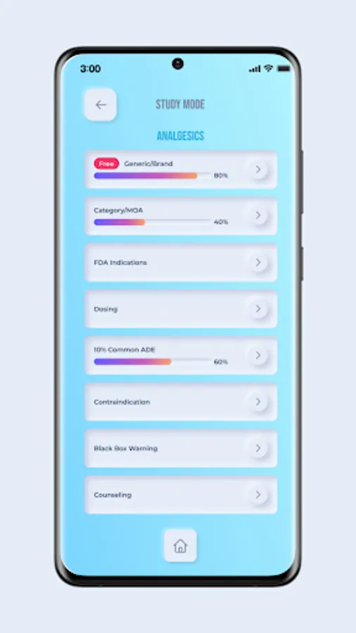 • Study mode: This mode utilizes a unique algorithm that focuses on strengthening users' weaknesses by focusing on questions that the user answers wrong. The system will start with a maximum of 20 questions, which will repeat until you answer the question correctly three times. As you master each question, a new question will be introduced. The study progression will be saved and shown on the study mode's main page so the user can pick up where they left off.
