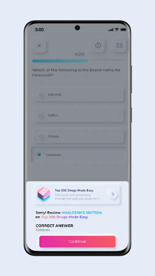 • Game mode: Have fun and challenge yourself by answering 20 random questions in any category (30 seconds per question). Each question answered correctly will be counted as one point. The top-scoring users will make it to the Top 50 Leaderboard. The first-place winner may get a chance to win a surprise gift from Top 300 Drugs Made Easy. Free users will be limited to play the Game Mode for up to 3 times per day.