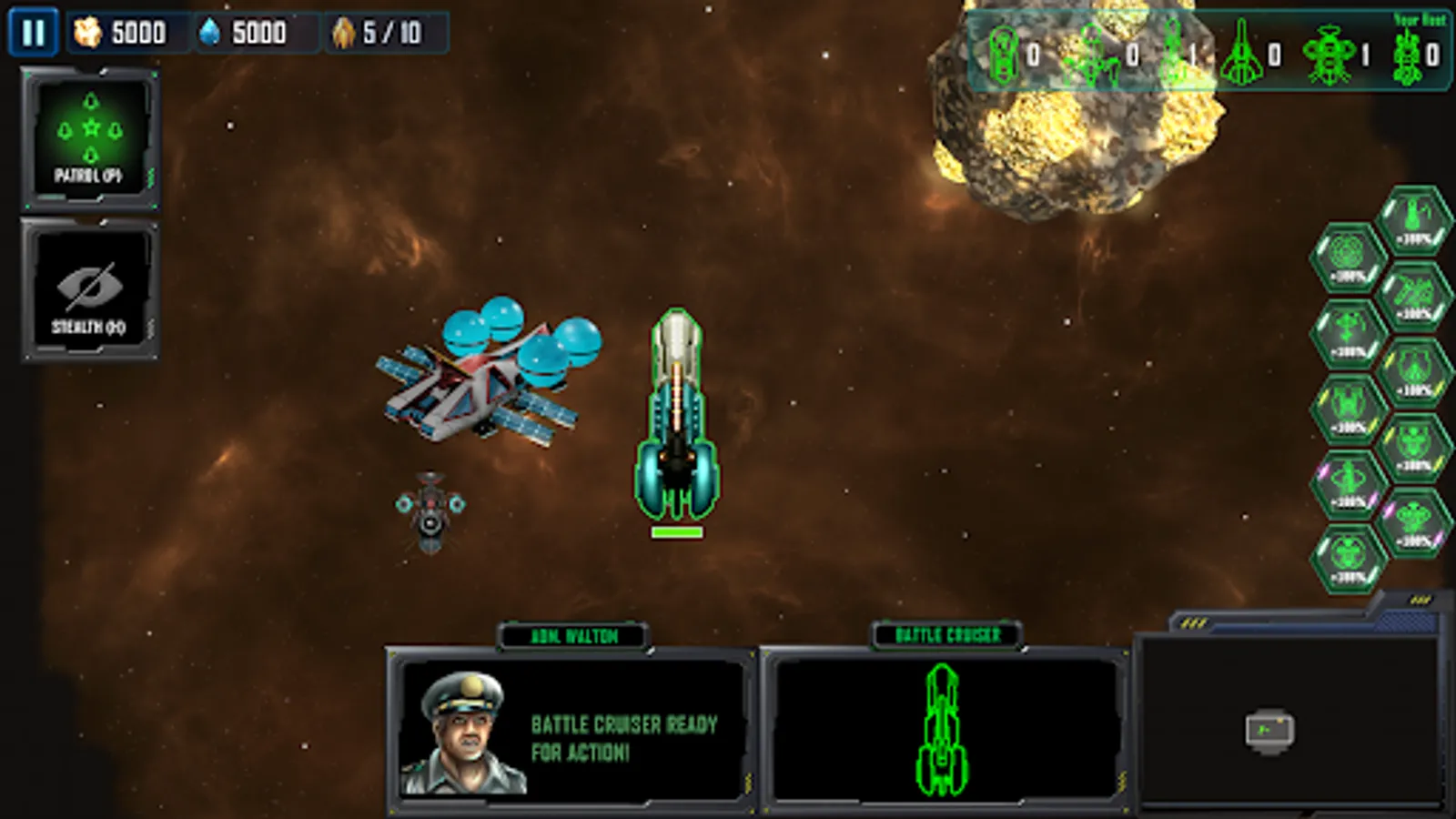 - Resupply mission: if you are running low on ships and resources, you will have access to a procedurally generated mission with asteroids and just a few enemies.