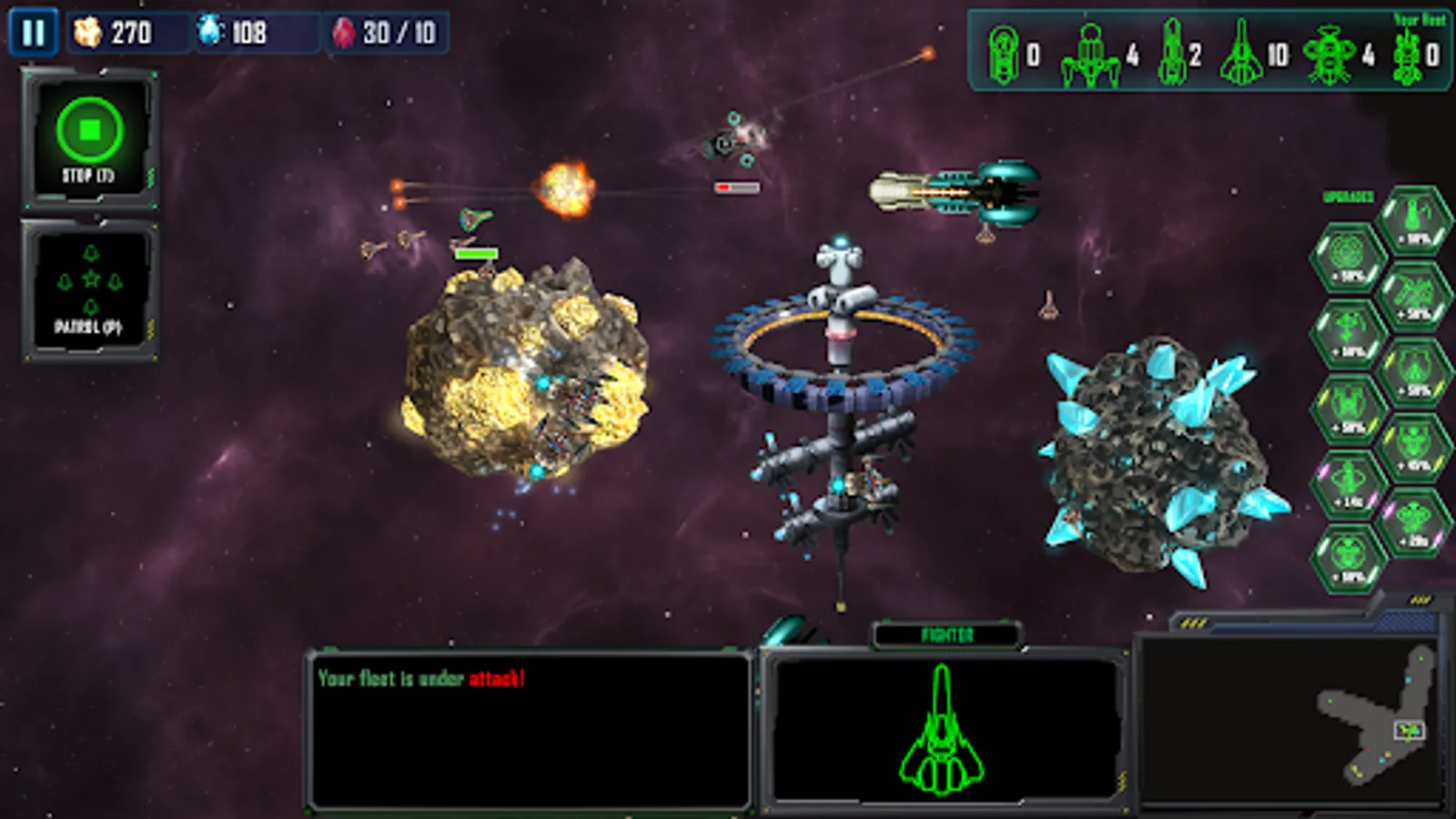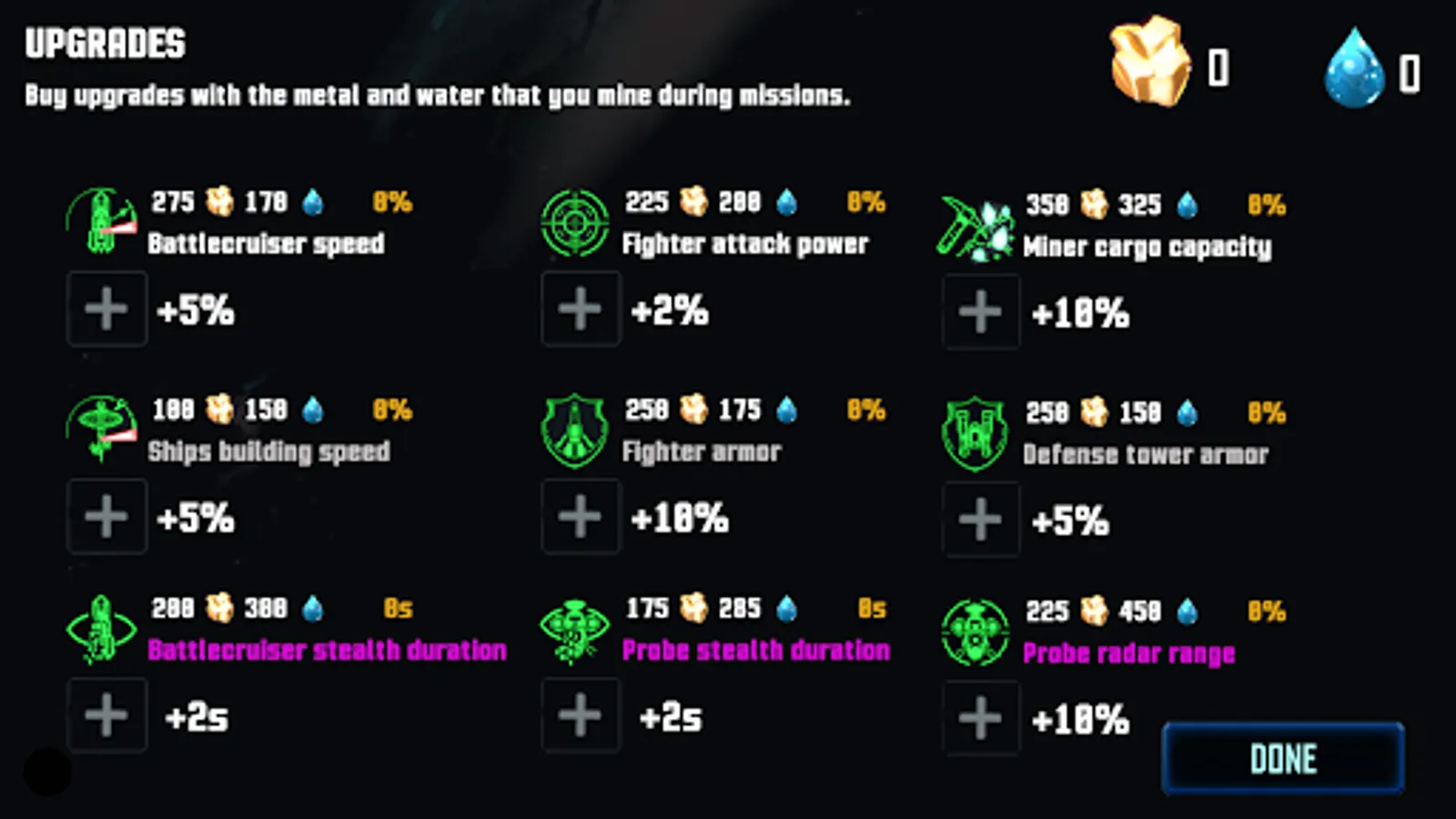 - Upgrades store: trade accumulated metals and water for upgrades for your fleet. Your ships can be faster, stronger and sturdier!