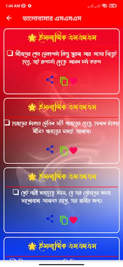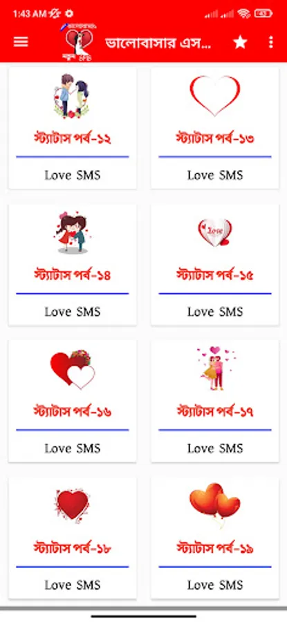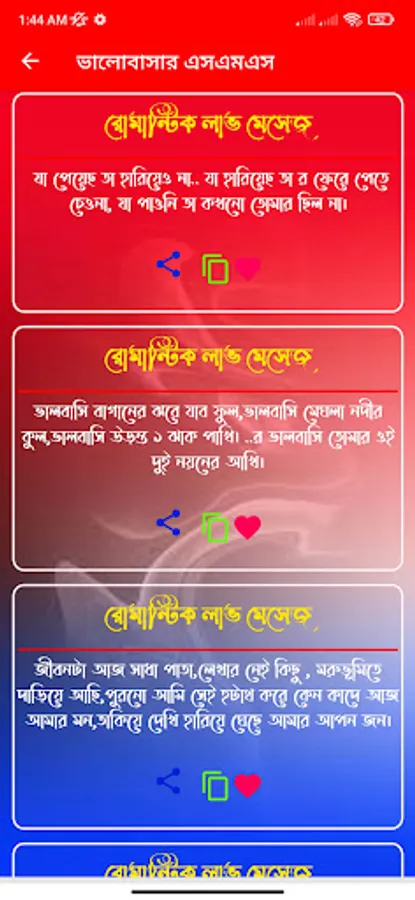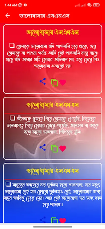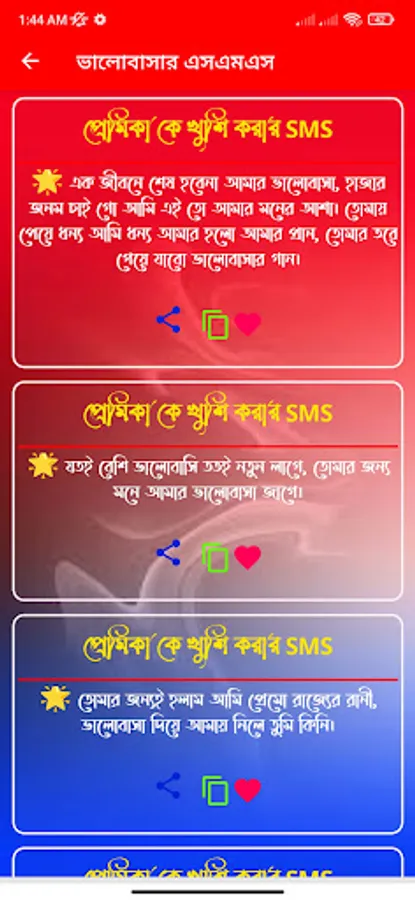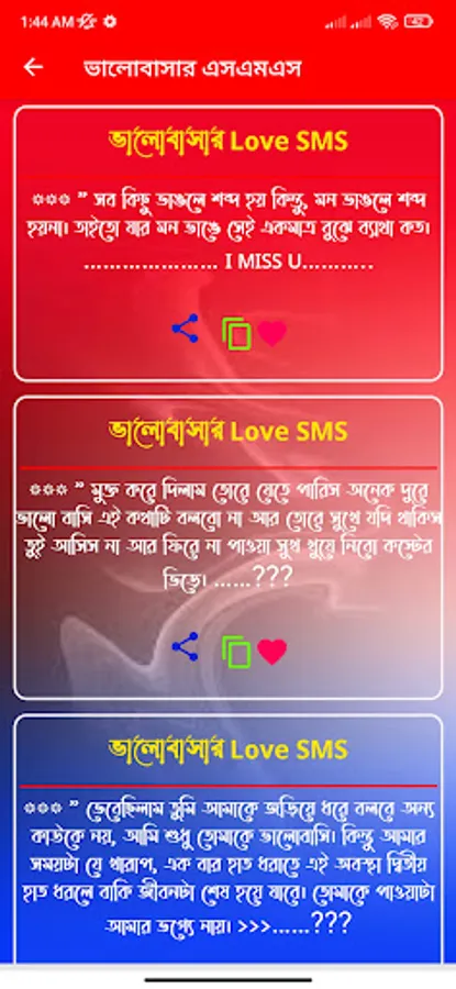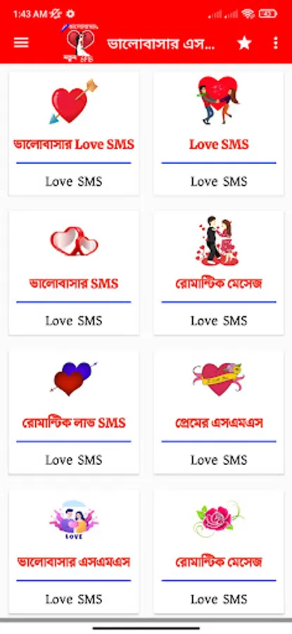 মনের মানুষকে খুশি রাখতে প্রয়োজন হয় এসএমএস,কবিতা অথবা ছন্দ। আর এই এসএমএস সবাই সাজিয়ে লিখতে পারেন না। তবে চিন্তা নেই আমরা আপনার জন্য নিয়ে এলাম সকল দরনের ভালোবাসার এসএমএস বা ভালোবাসার মেসেজ অ্যাপ। আপনি শুধু পড়বেন, আর যেটা আপনার পছন্দ হবে সেটা আপনি আপনার প্রিয়জনের সাথে Share করতে পারবেন। Share করার জন্য এসএমএস এর নিচে Copy এবং Share এর বোতাম দেয়া আছে, সেই বোতামটি টিপে আপনি সেই এসএমএস টি Share করতে পারেন।