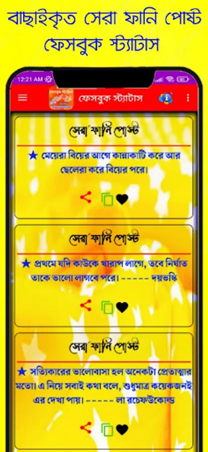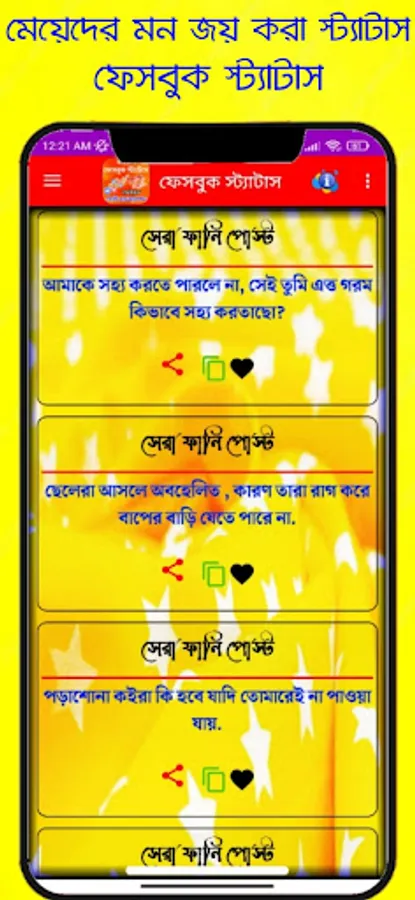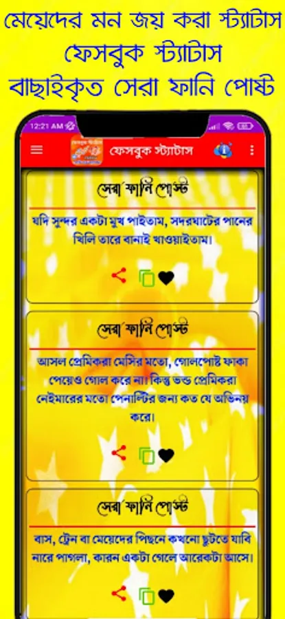 আজকের এই অ্যাপসটিতে কয়েক শত ফানি পোস্ট ফেসবুক স্ট্যাটাস ও ক্যাপশন দিয়ে আমাদের এই অ্যাপসটি সাজানো হয়েছে । যা আপনি প্রতিদিনই আপনার ফেসবুকে টাইমলাইনে শেয়ার করতে পারবেন। তাহলে আর দেরি না করে এখনি অ্যাপটি ডাউনলোড করে করে নিন।
