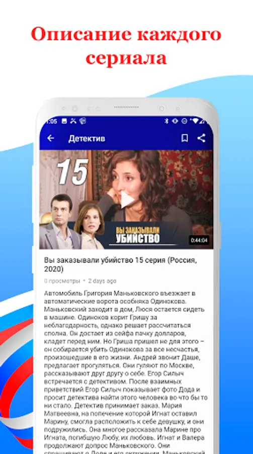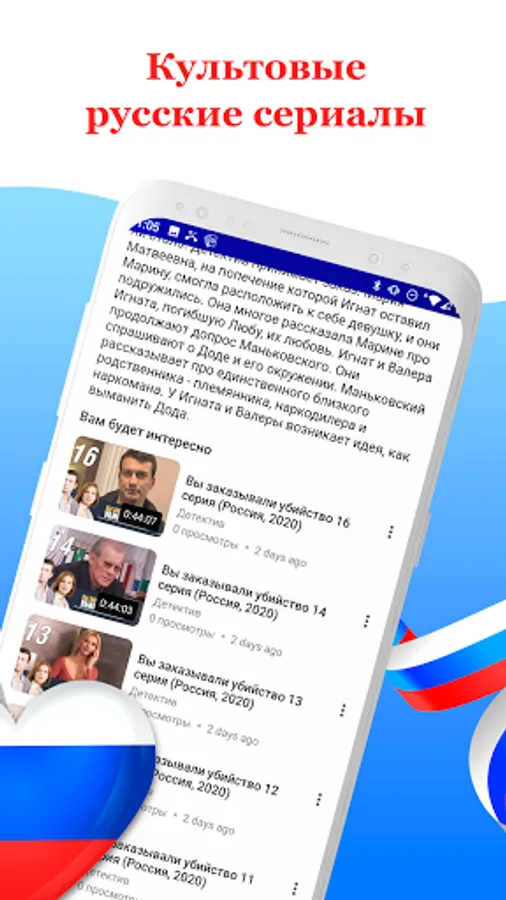 The application "Russian serials" is an online cinema where you can watch our movies with maximum comfort. You will have the opportunity to watch Russian TV series online for free without a subscription . Suitable for use on smartphones and tablets, regardless of the version of the operating system. The application contains Russian serials of various genres, including: