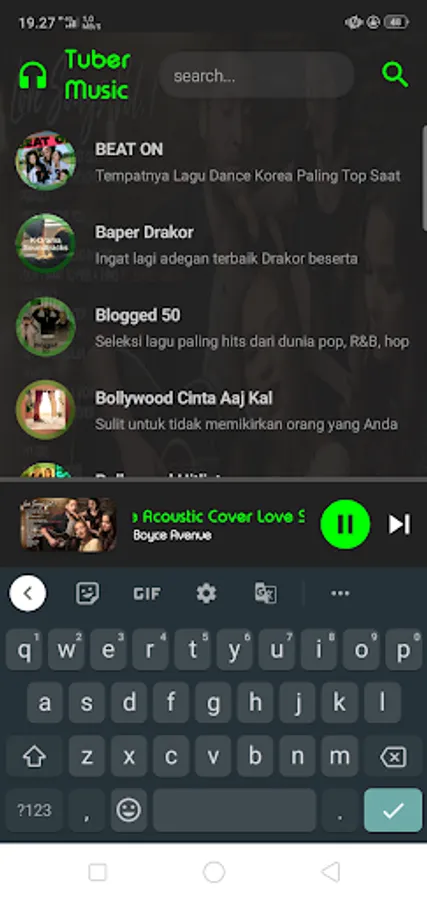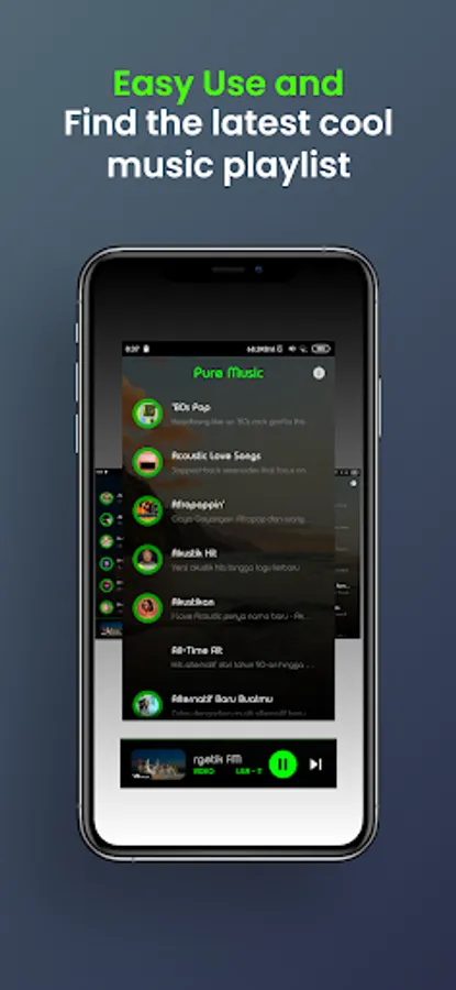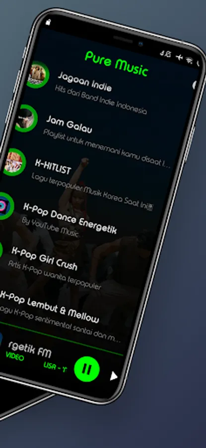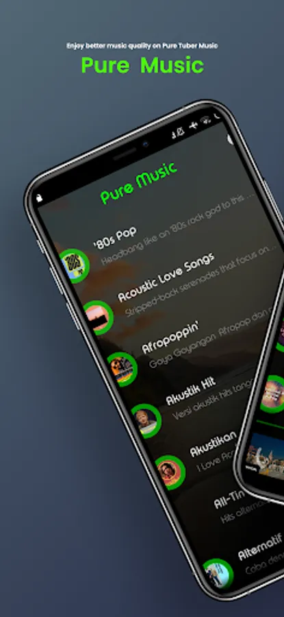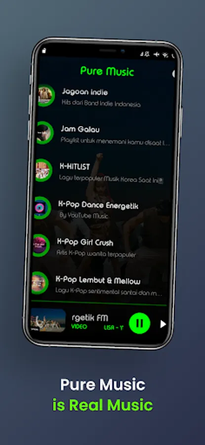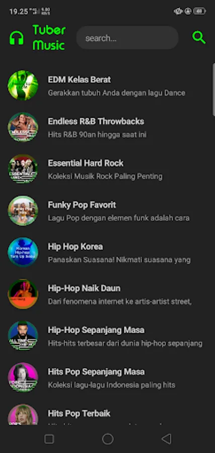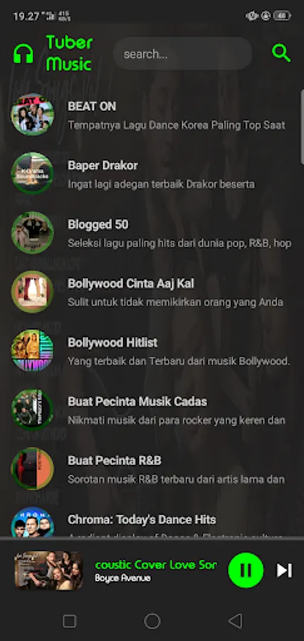 Various categories of playlist genres that are tailored to the mood from a collection of millions of songs and music genres available in music applications including popular, Ost Anime, Korean Drama, Ost Film, tuber, DJ, Game, Backsound, pure, Rock, Metal, R&B, Hip Hop, Kpop, Jazz, Pop, EDM, Dance, Dangdut, Reggae, tube, Acoustic, Cafe and many more.