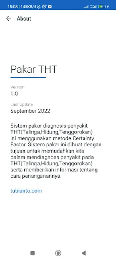 This expert system for diagnosing ENT (Ear, Nose and Throat) disease was created using the Certainty Factor Method. The purpose of making this ENT Expert application is to make it easier for us to diagnose diseases in ENT (Ear, Nose and Throat) and provide information on how to handle it.