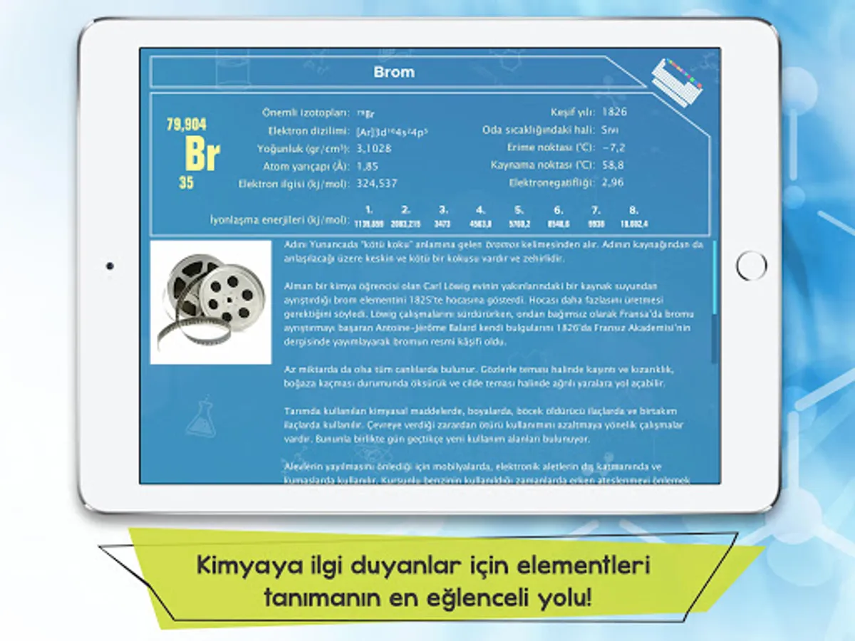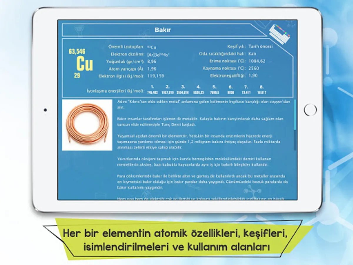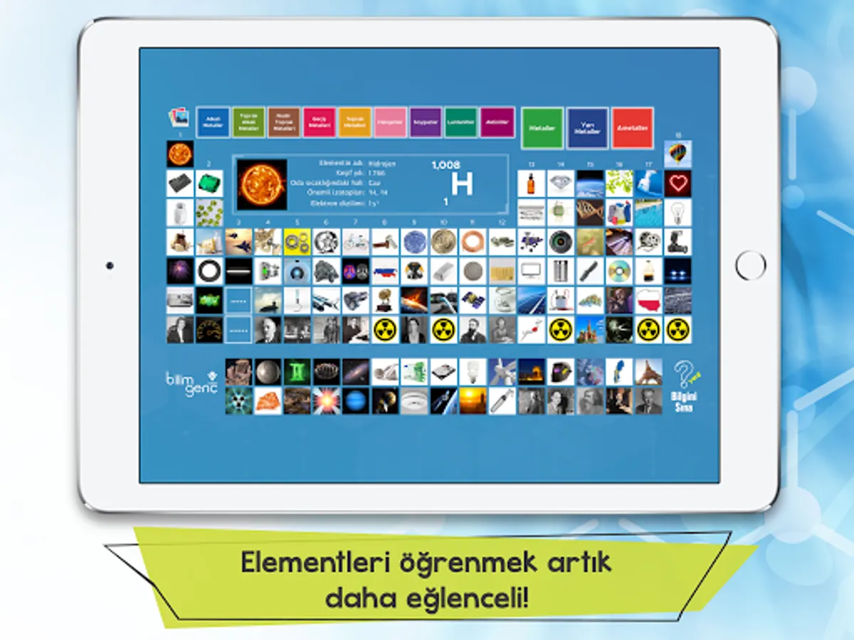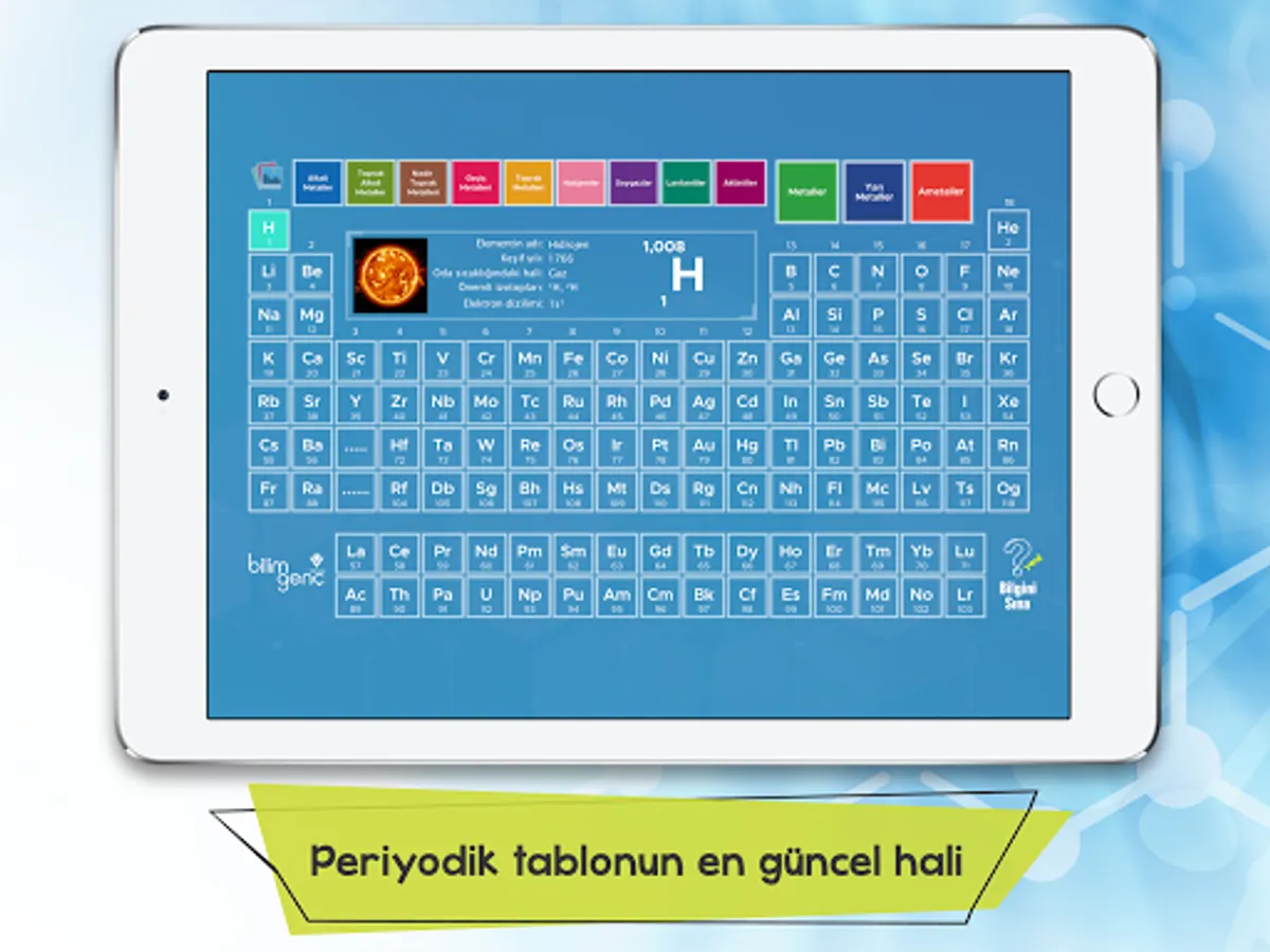 In the application we have prepared for you, we have explained the quantitative properties of each element in the periodic table, as well as interesting information about its discovery, where it got its name, its uses in daily life, its effects on the human body and how it is used for scientific purposes. With the titles we offer in the application, you can filter all the elements according to different classification methods and see how many elements are in each title. It will now be more enjoyable to get to know the elements with the mobile application, where we also include interesting photos about the usage areas, sources and chemical properties of the elements!