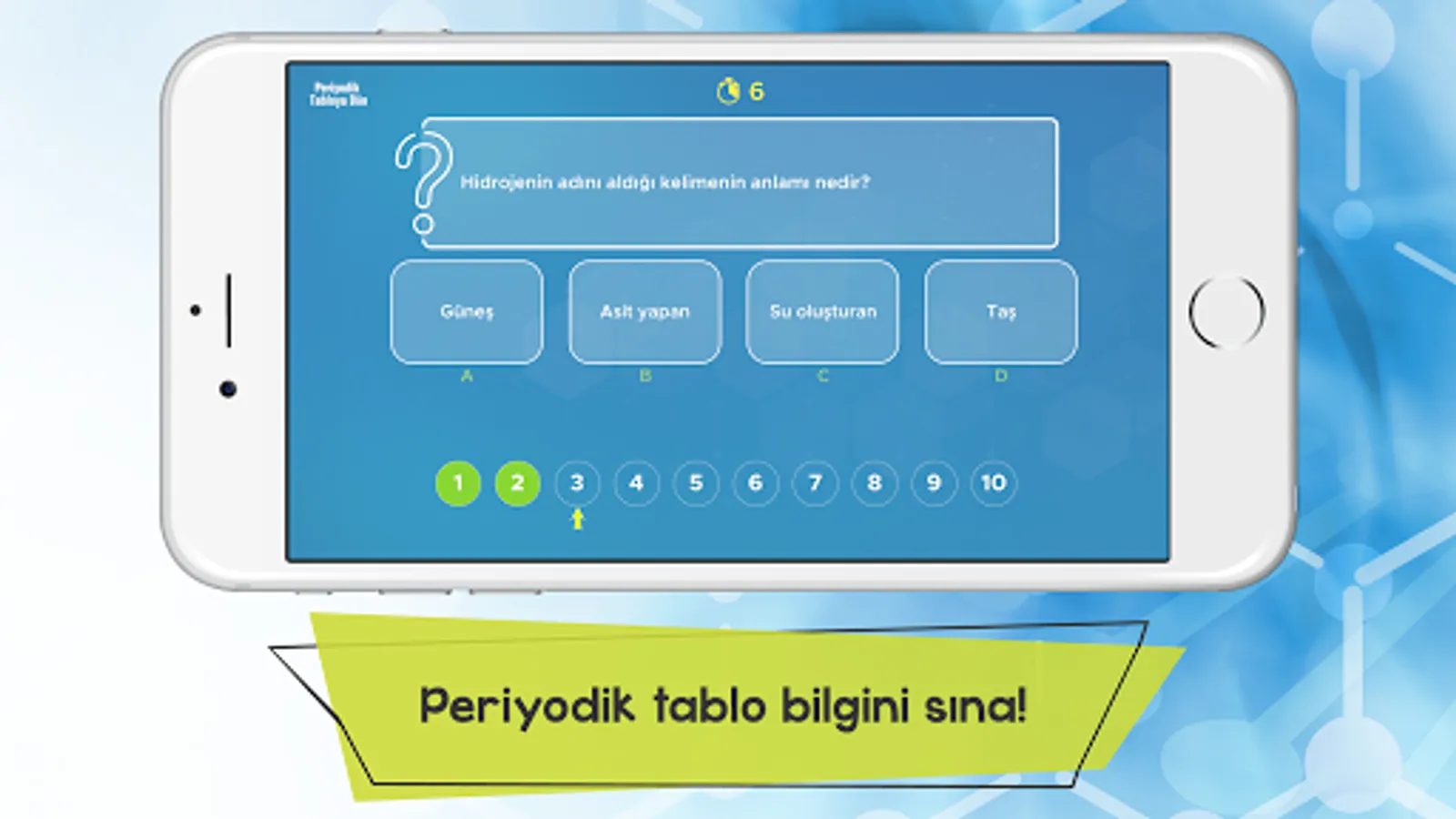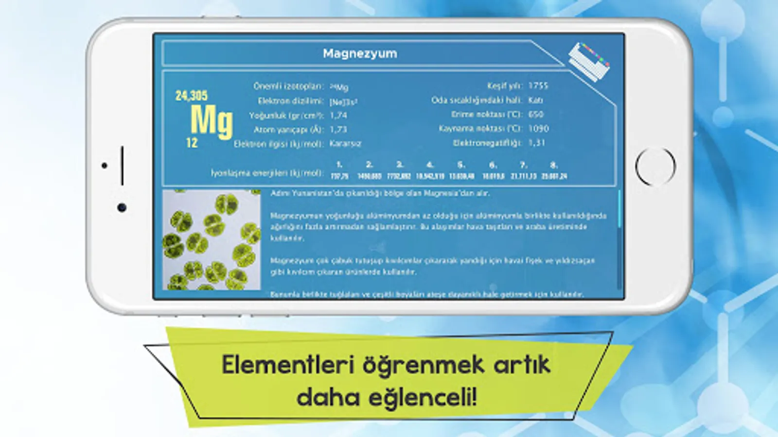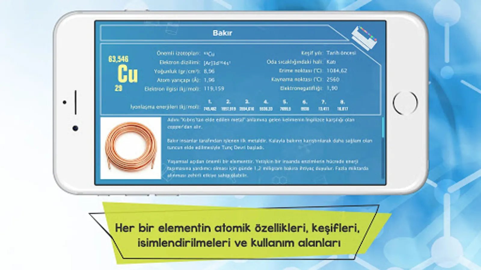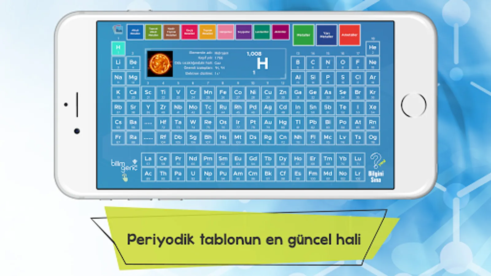 In the application we have prepared for you, we have explained the quantitative properties of each element in the periodic table, as well as interesting information about its discovery, where it got its name, its uses in daily life, its effects on the human body and how it is used for scientific purposes. With the titles we offer in the application, you can filter all the elements according to different classification methods and see how many elements are in each title. It will now be more enjoyable to get to know the elements with the mobile application, where we also include interesting photos about the usage areas, sources and chemical properties of the elements!
